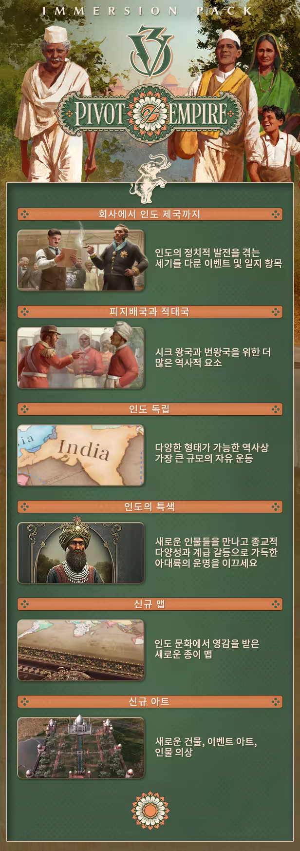 Pivot of Empire는 민간 기업에 의한 정부에서 독립 운동의 시작에 이르기까지, 이 시기 인도의 사회적 발전을 중점적으로 다루고 있습니다. 왕관의 보석으로 여겨지는 인도를 둘러싸고 변화의 물결이 소용돌이치는 가운데, 인도 아대륙의 다양한 문화가 번영과 잠재적 자유를 향해 나아갈 수 있도록 인도하세요. 인도의 국민을 자치와 세계적인 운명으로 이끌거나, 세계에서 가장 강력한 제국의 중심지 역할을 유지하세요.