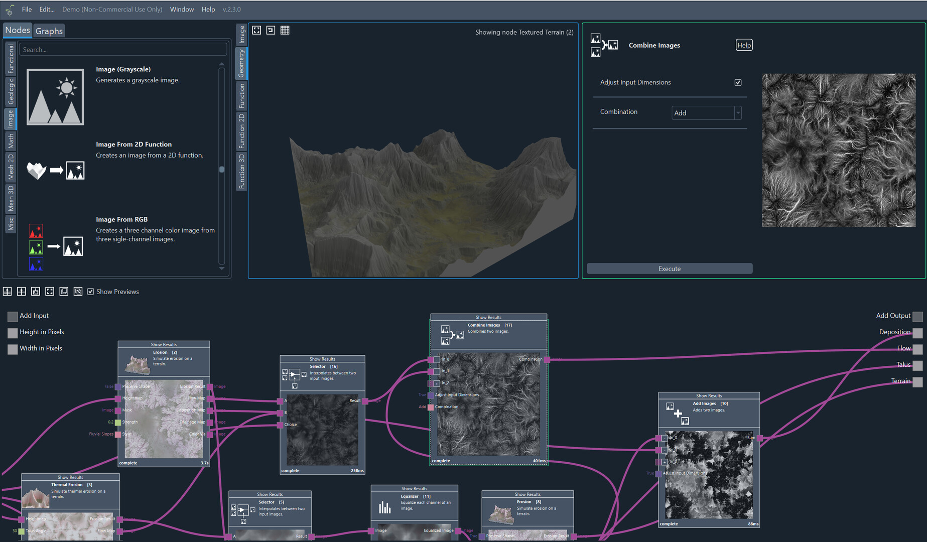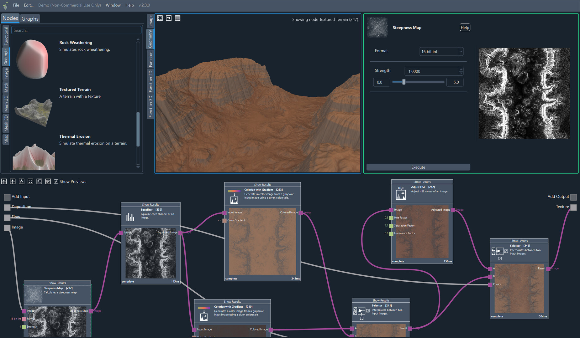 Authentic Terrain Generation: Stunning terrains can be crafted using hydraulic and thermal erosion techniques. Node-based texturing enhances terrains with realistic effects that mimic natural processes.