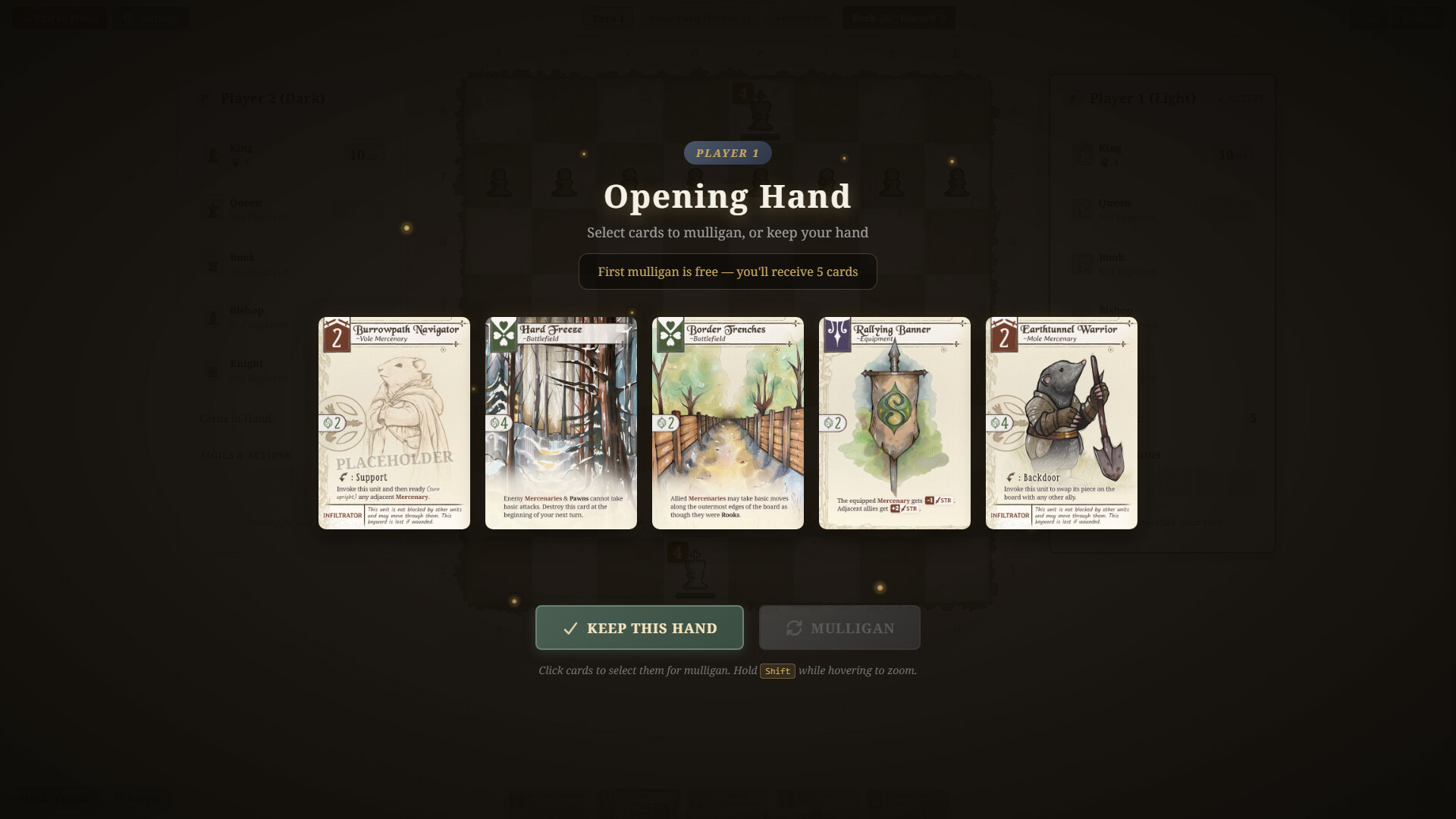 Sylvan Tactics combines the tactical depth of chess with the strategic variety of deck-building card games. Command Kings, Queens, Pawns, and powerful Mercenaries across an 8x8 battlefield, using cards to turn the tide of battle and reduce your opponent's King to zero health.