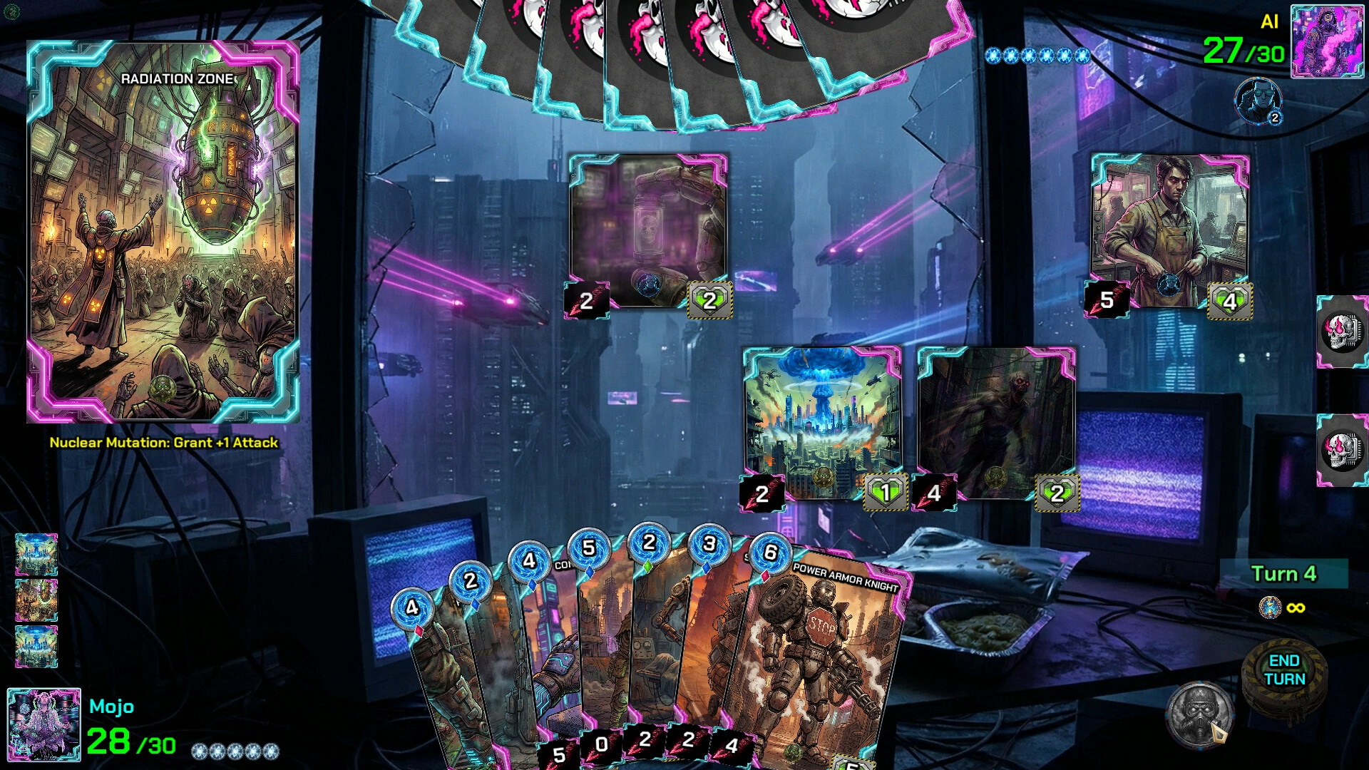Radiation Zone: Mutants thriving in the nuclear waste. Embrace the "Nuclear Mutation" to permanently grant a unit +1 Attack. Let the radiation fuel your strength and overwhelm the enemy with raw power.