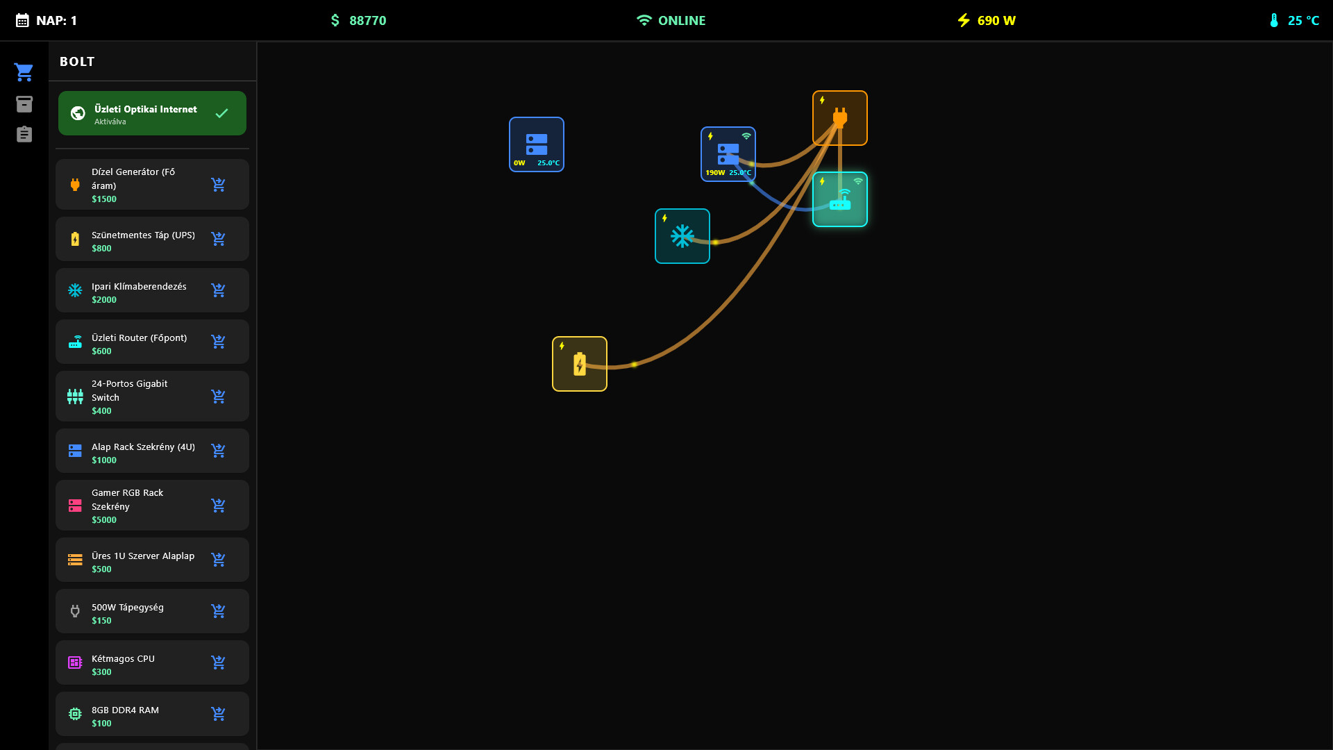 Graph-Based Cabling Simulation: Connect your devices with realistic network (CAT6) and power cables. Watch the animated data flow and ensure every machine receives both power and internet.