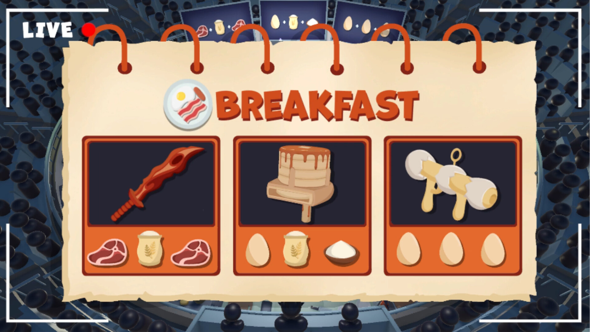 After successfully (or unsuccessfully) cooking your weapons, battle against your foes in the second round of the show. Win by landing the most hits and dodging attacks from the other players, the audience will vote for the stand-out chef!