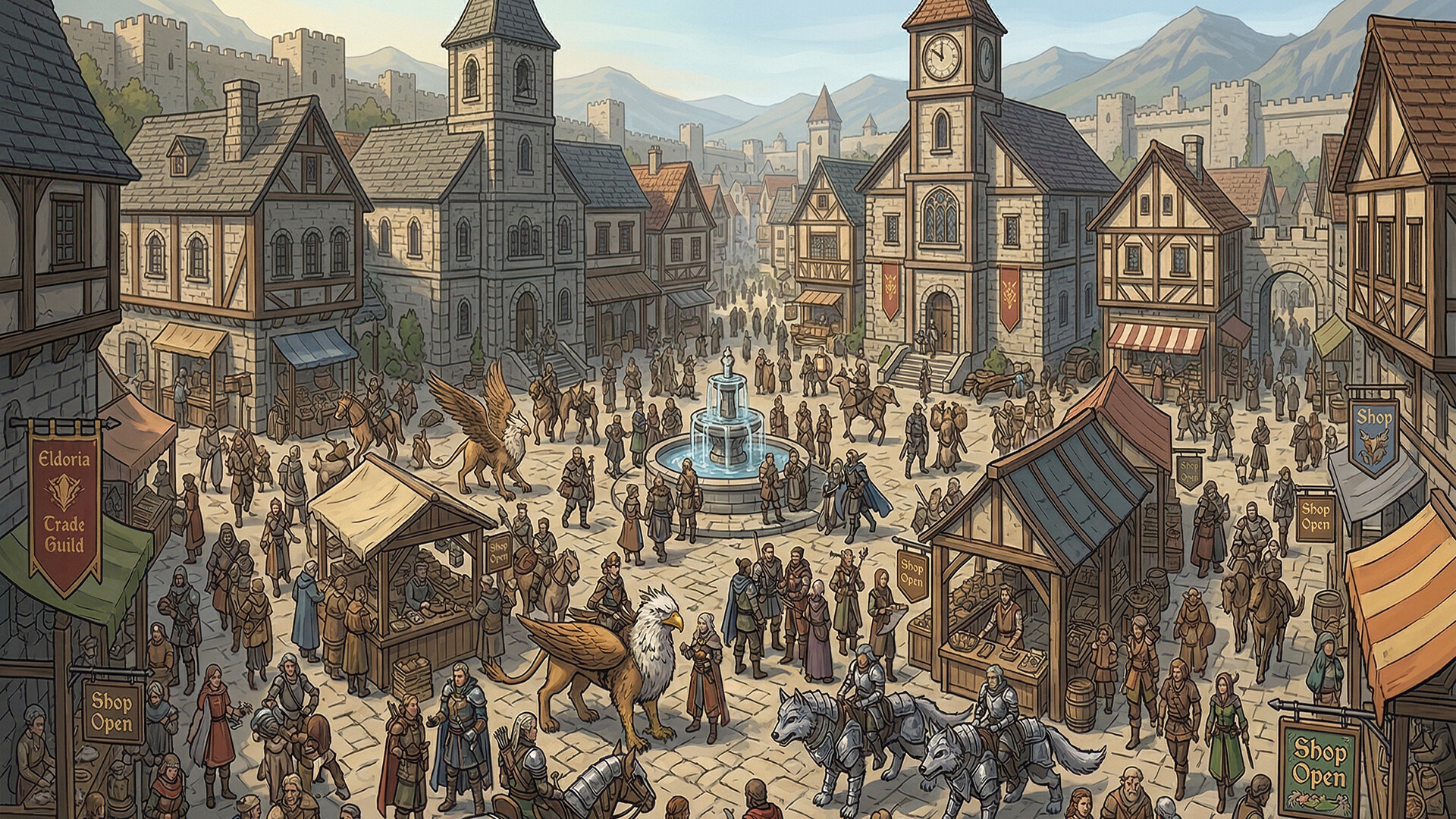 The Hub of Eldoria: Visit the bustling central city to recruit allies, set up player shops, or simply share tales of your latest discoveries in the global and local chat channels.
