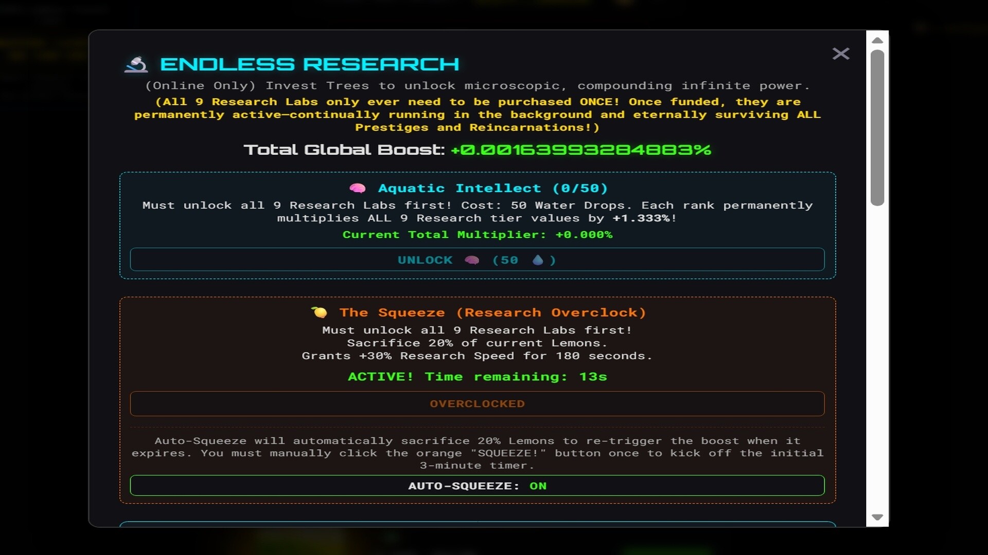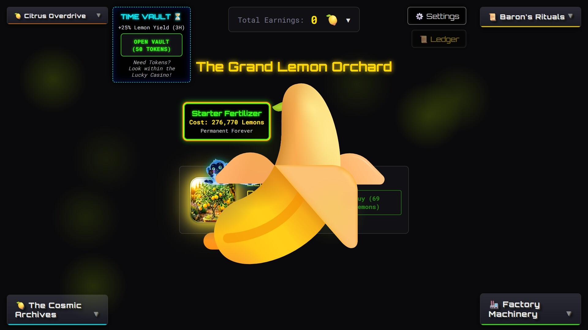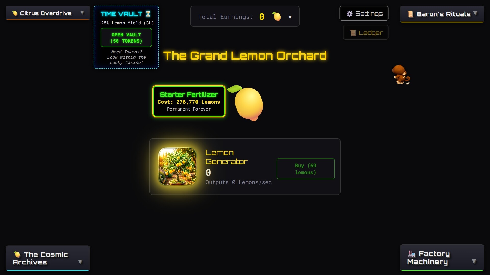 Welcome to the ultimate citrus empire! LaVonne's Lemons Idle starts as a simple, relaxing game about harvesting a single lemon tree and quickly spirals into an astronomically massive, universe-spanning industrial tycoon. What begins with wooden buckets and old rakes will soon evolve into Dark Matter Assemblers, Cosmic Orbitrons, and reality-bending Stargates!
