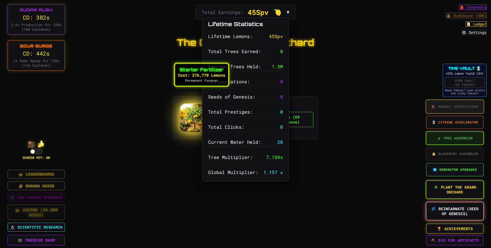 Your Personal Screen Pet Macaque! Why build an empire alone? LaVonne's Lemons features a fully integrated, interactive 3D Screen Pet Monkey (168 Custom Screen Pet Animations) that lives directly on your game screen! Toggle the pet on, and watch him autonomously roam your desktop while you play. Between hula-dancing, reading the Orchard Manual, blowing bubbles, and skateboarding across your UI, he doubles as an incredibly relaxing, dynamic screensaver while your factories churn out billions in the background!