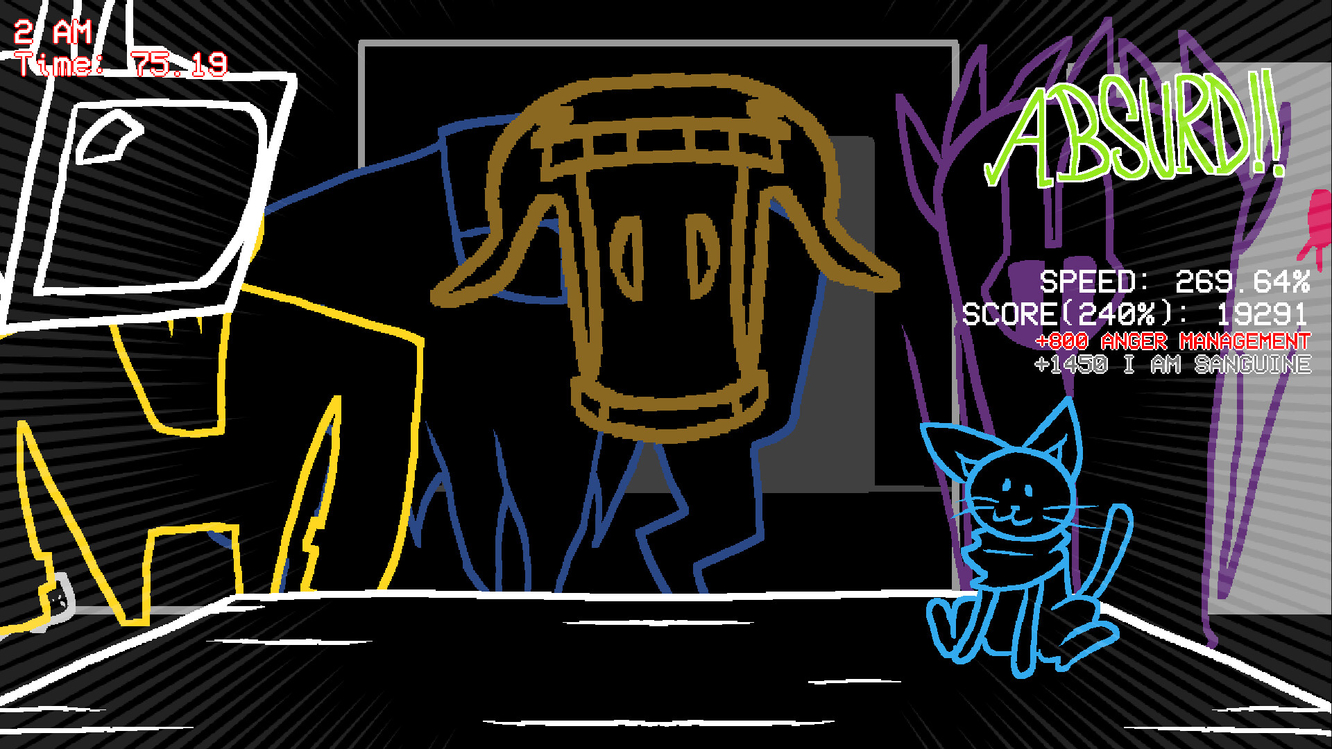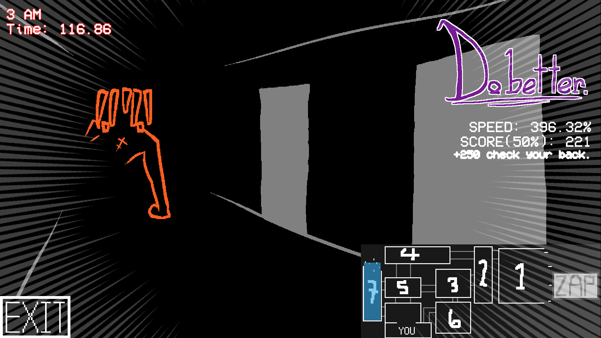 Use a rock, electric shocks, a gun and your bare hands to fend off the demons trying to kill you. Survive until 6 AM and make another lap around until Ms. Yahweh says you've reprieved enough!