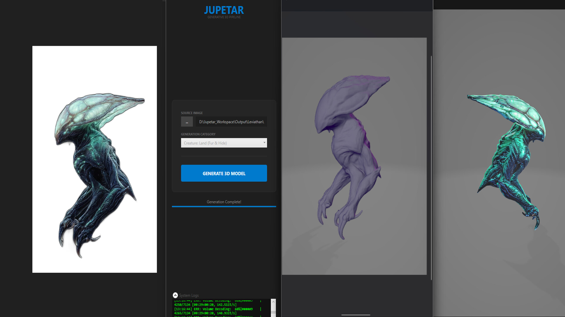 TURN 2D IMAGES INTO 3D BASE MESHES IN MINUTES. Jupetar is a powerful, locally-hosted generative 3D pipeline. Built on the cutting-edge Hunyuan3D architecture, it transforms a single 2D image—a concept art sketch, a photo, or a texture—into a fully textured GLB model to kickstart your 3D workflow.