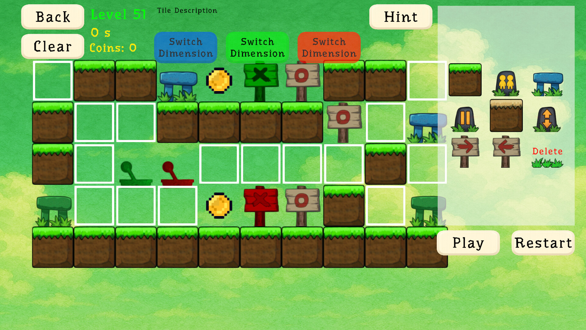 As the challenge grows, so does the variety of tiles you must master. Arrow tiles turn the character left or right and redirect movement. Gravity inversion tiles flip the character onto the opposite surface and change the way the level must be approached. Lever tiles unlock gates and open new paths. Disappearing platforms create temporary routes that must be used carefully. Spike tiles punish unsafe paths. Cloning tiles add a new layer of strategy by creating extra characters, forcing you to think about multiple movements at once. Teleporting tiles instantly move the character from one point to another and open up new ways to cross the level. And dimension switch tiles send the character into a parallel version of the same grid, where the layout, hazards, and opportunities can be completely different.