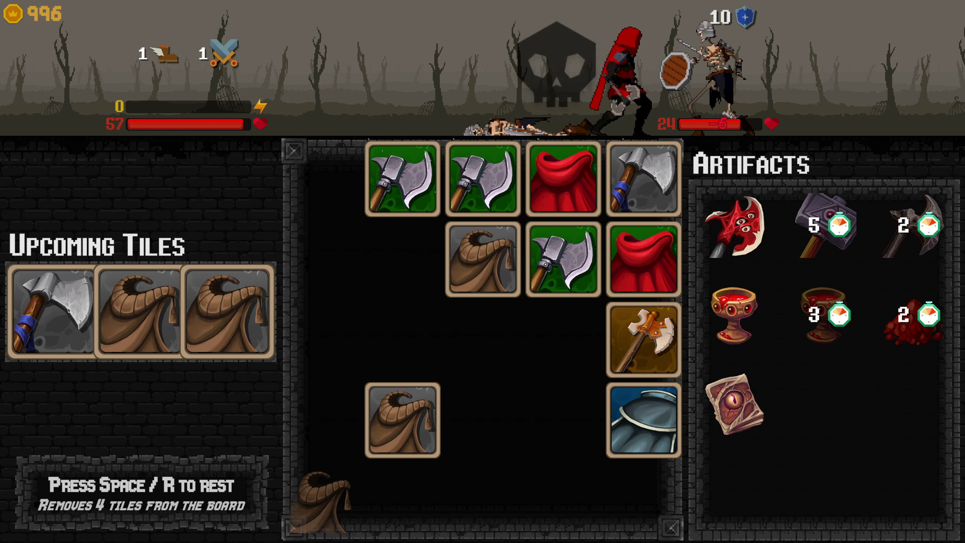 Whenever you push two of the same tiles into one another, they merge into a higher level and activate their effect. This is how you swing your sword, shoot your bow, raise your shield and do much more. As the level of each tile gets higher, its effect becomes increasingly powerful; adding piercing damage, crippling your enemy or removing debuffs from your character. Just take care that your board doesn’t jam up, or you’ll have to take a rest to clear it up.