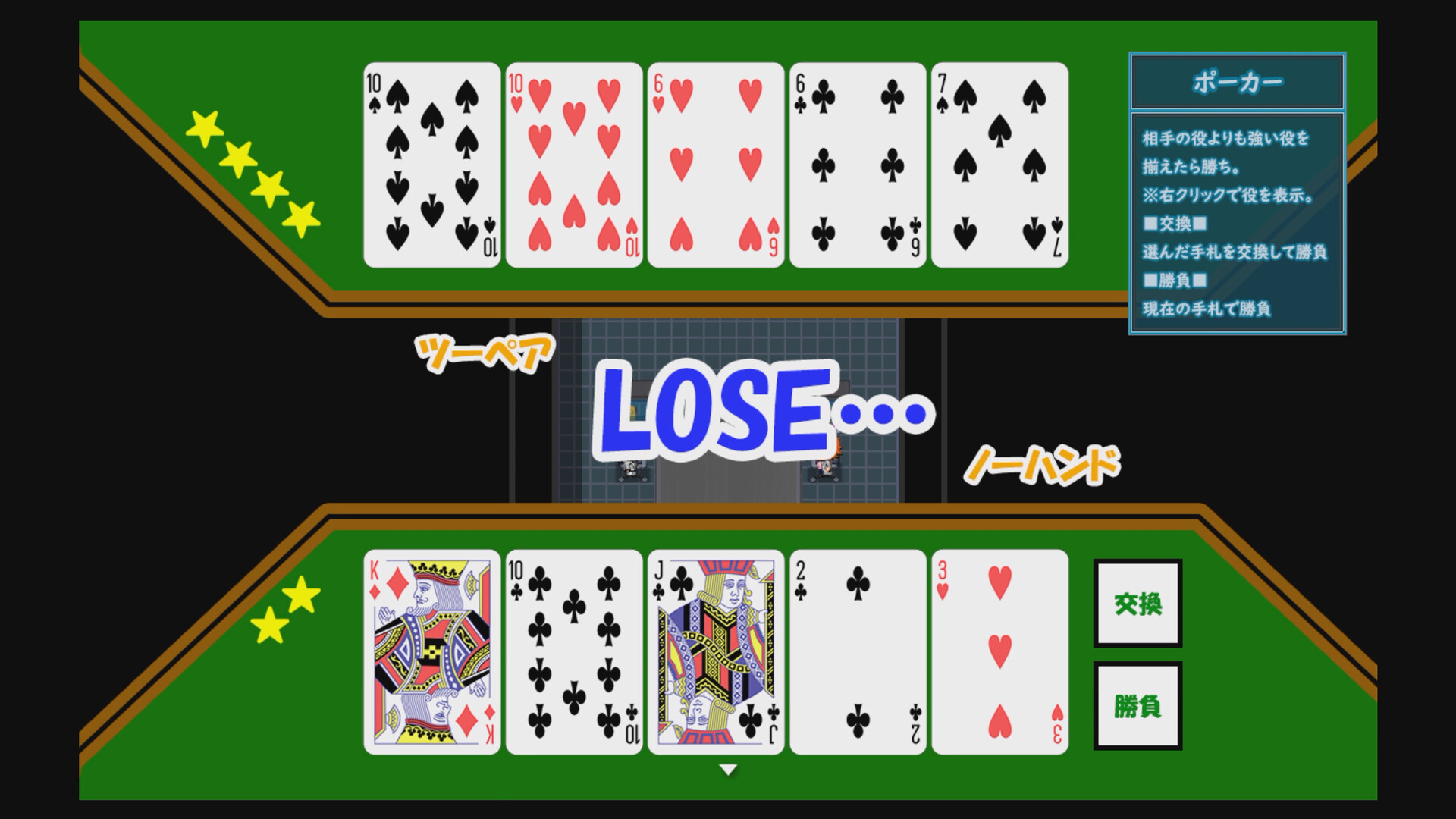 ◎포커: 다섯 장의 트럼프 카드를 패로 하고, 쌍방이 패를 공개하기 전에 다시 뽑을 장수를 정한다. 모든 카드를 교환할 수 있는 것은 한 번뿐. 카드를 공개하고, 어느 쪽의 카드가 더 강한지 겨룬다.