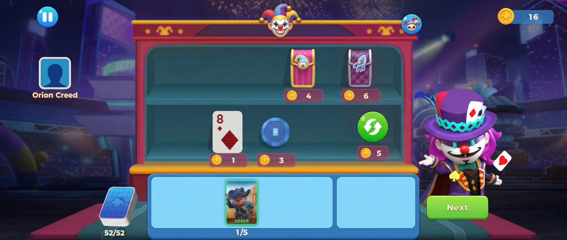 Jocard is a strategy card game that blends poker-style hands, deckbuilding, and roguelike progression. Combine cards, upgrades, and powerful Joker effects to create high-scoring combos and survive ever-rising challenges. Every run is a new experiment in luck, planning, and greed.