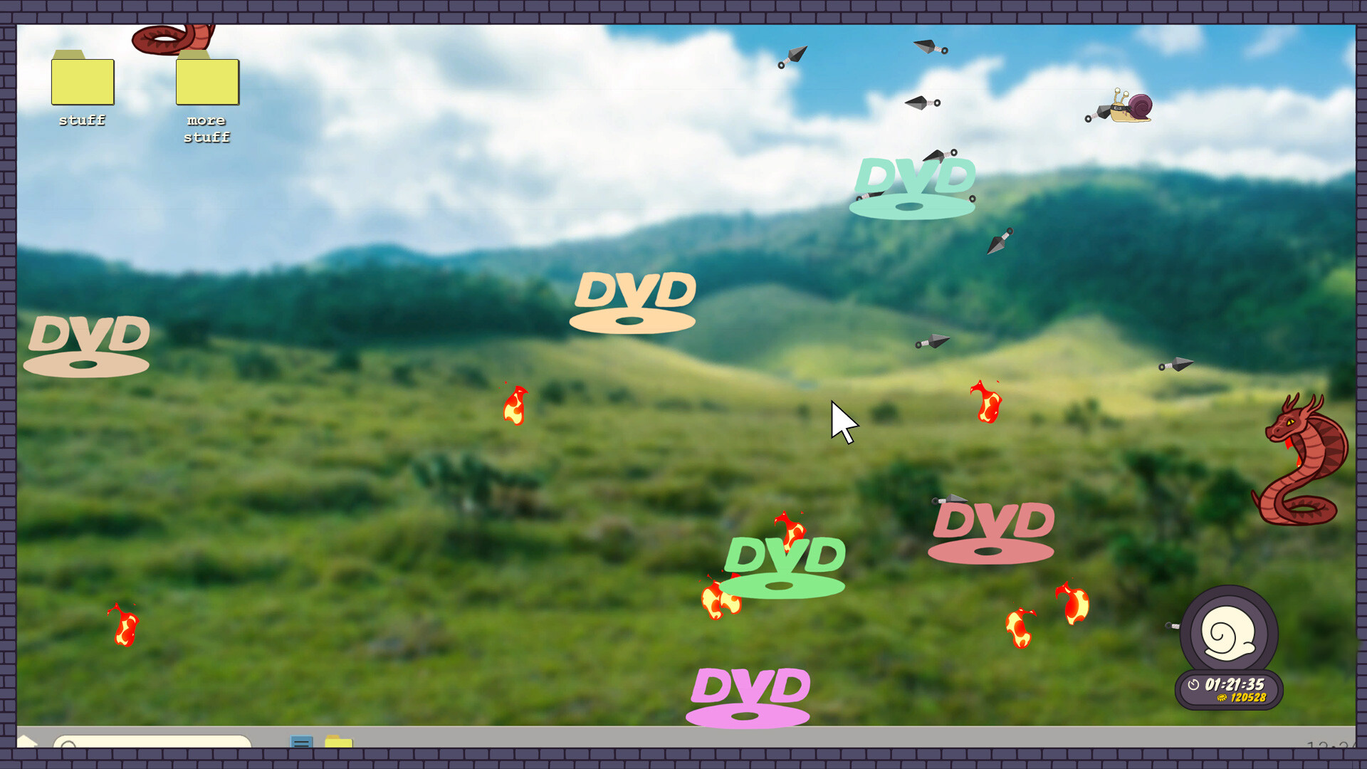 Survive a big variety of attacks. From shuriken tosses and bouncing DVD logos to a stampede of angry snuffalos, the Desktop Snail Assassin has many surprises up it's sleeve, so never let your guard down!