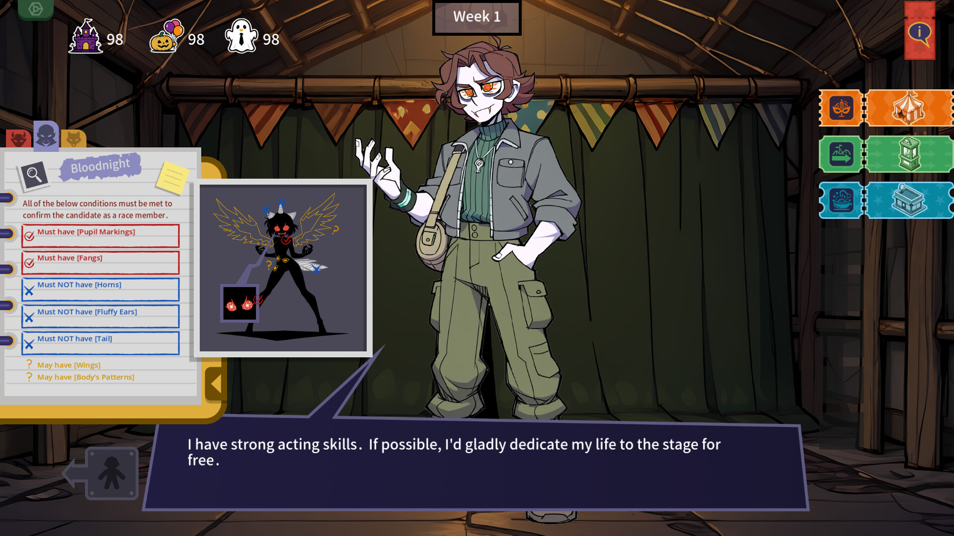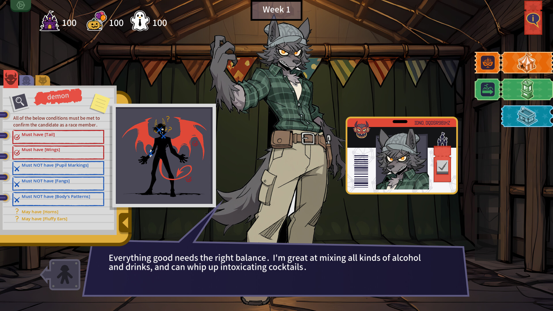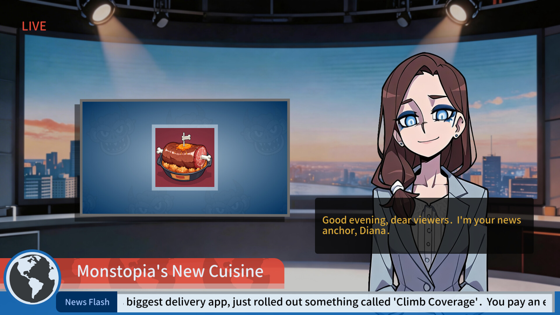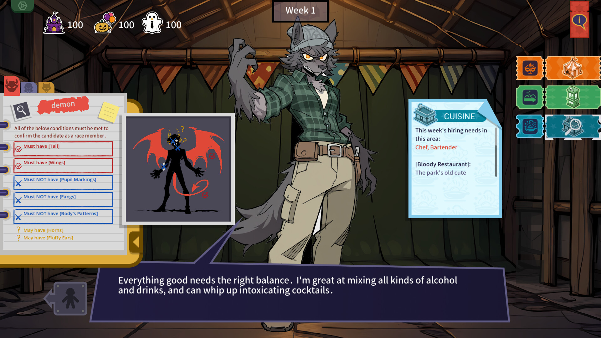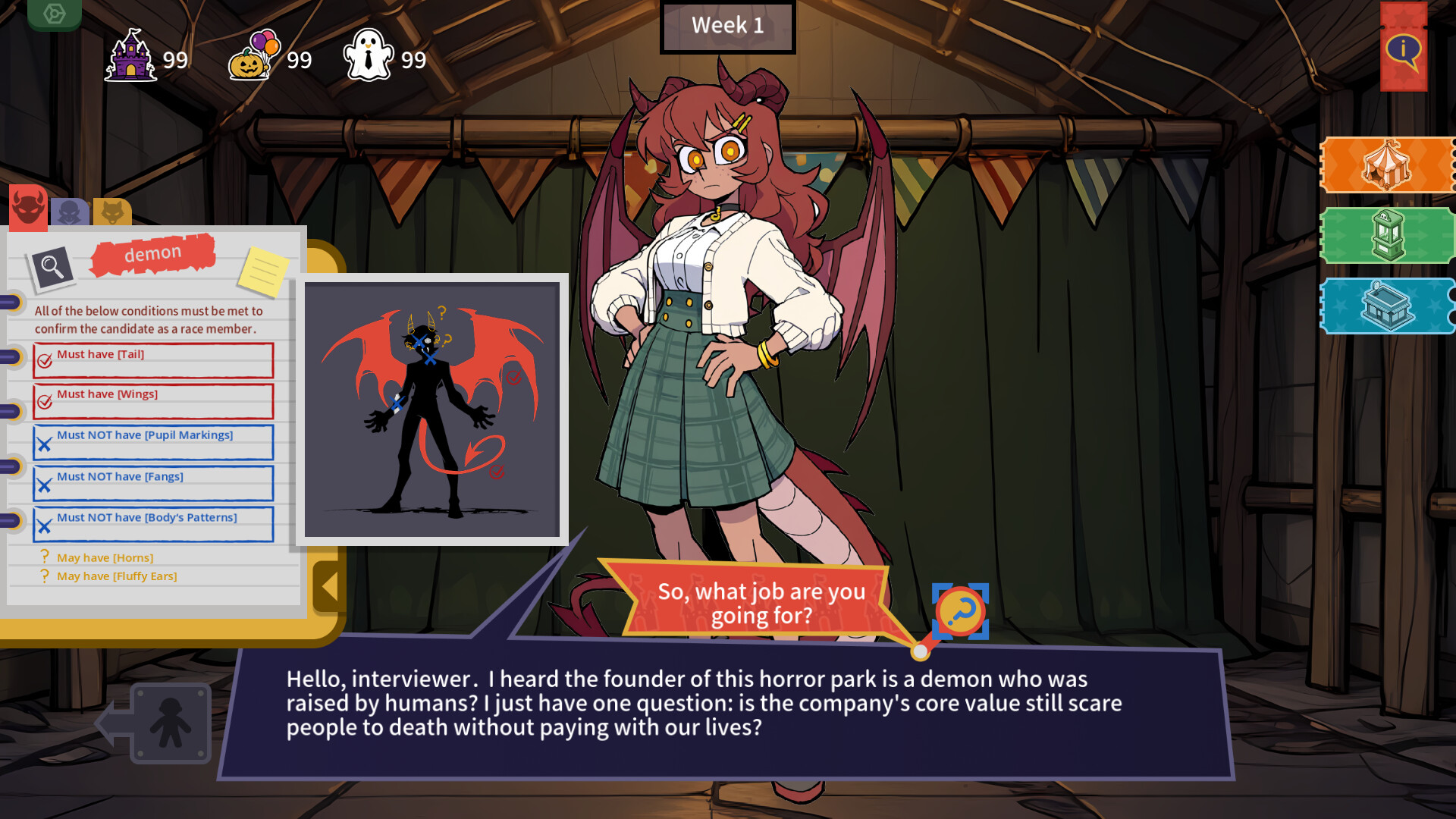 Monstopia is a narrative-driven, choice-based information comparison game. Players take on the role of a demon managing a horror-themed amusement park, interviewing different monster races to recruit the right "monster talents" for the park.