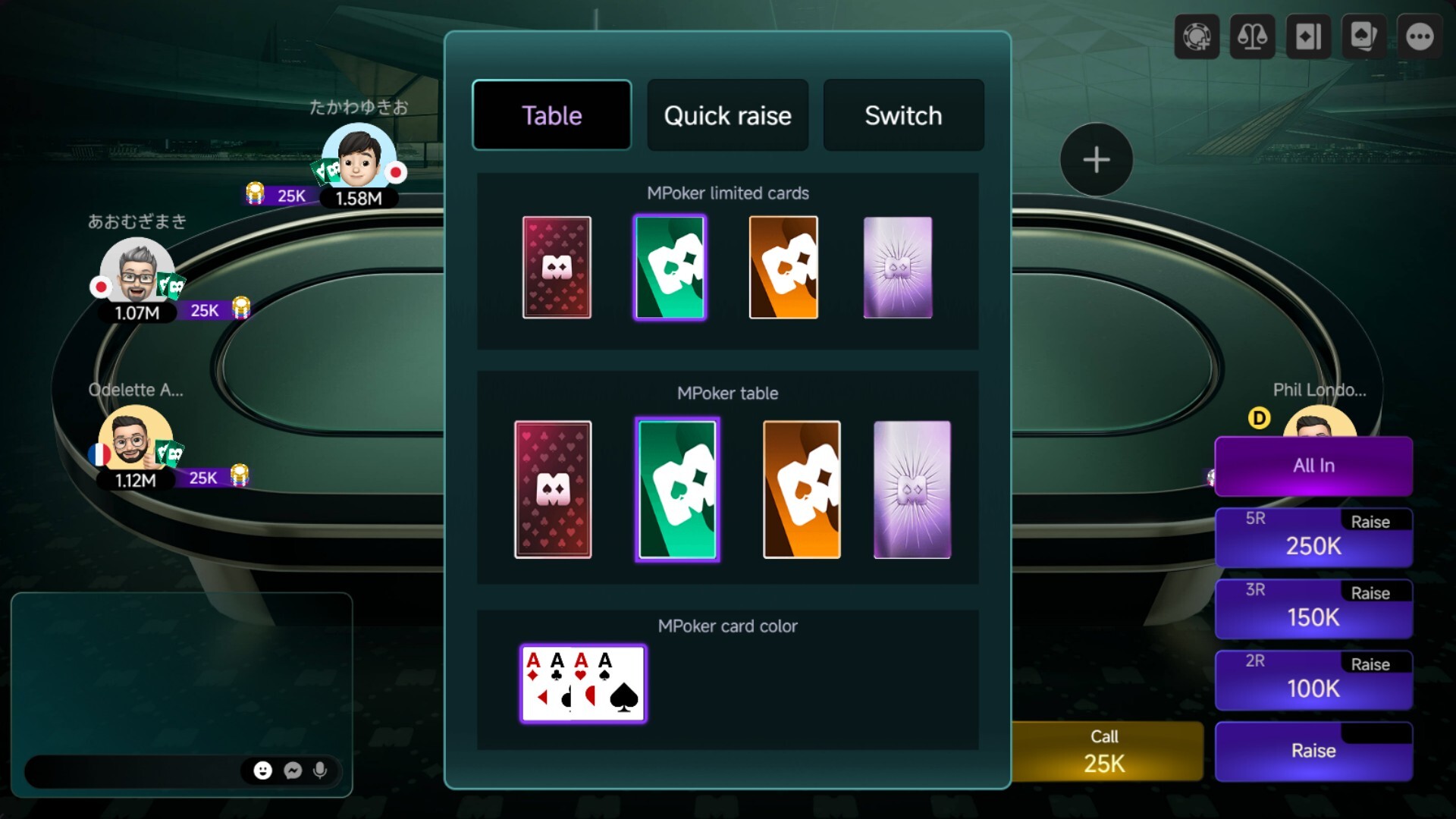 Events & Themes: table skins, and card faces (four-color deck supported).