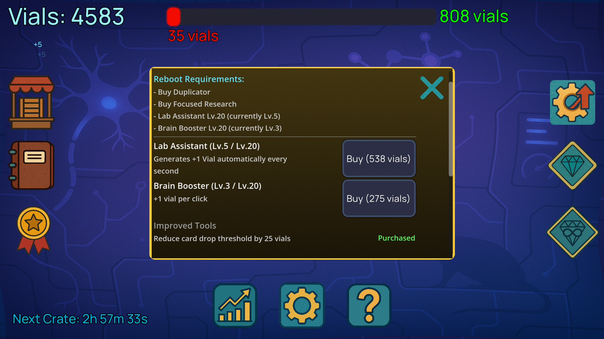 Alongside gaining vials, unlock cards for pure collection, until Lab Rebooting (prestige 1.0) becomes available, which then will be sacrificed for a new currency