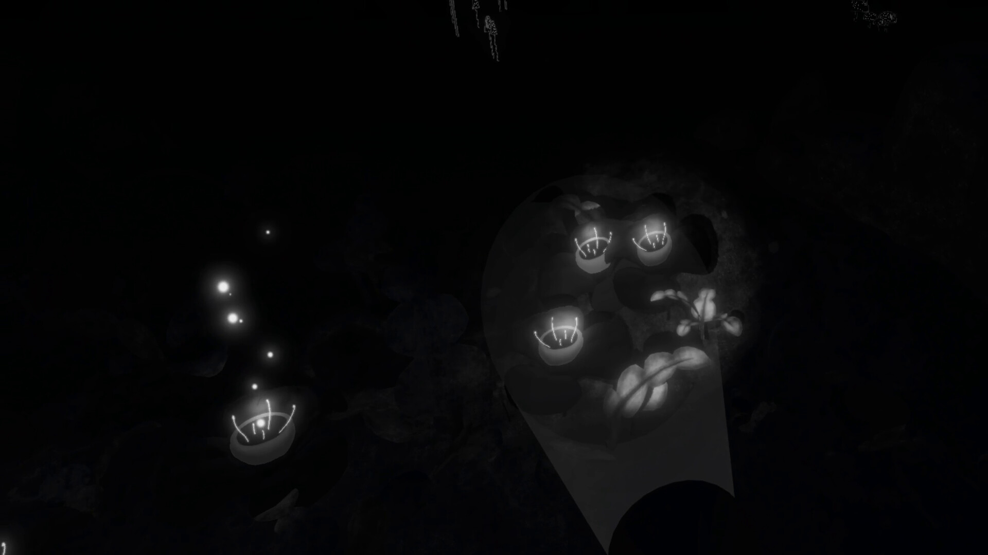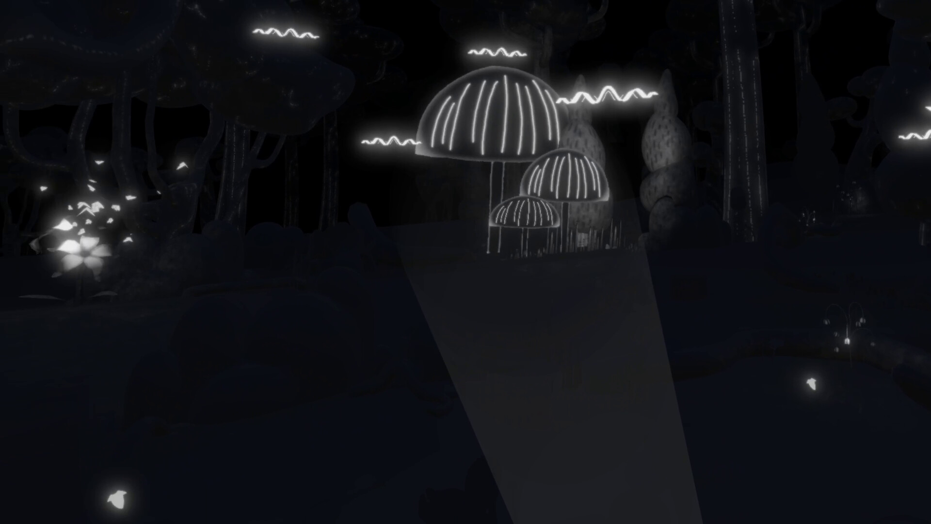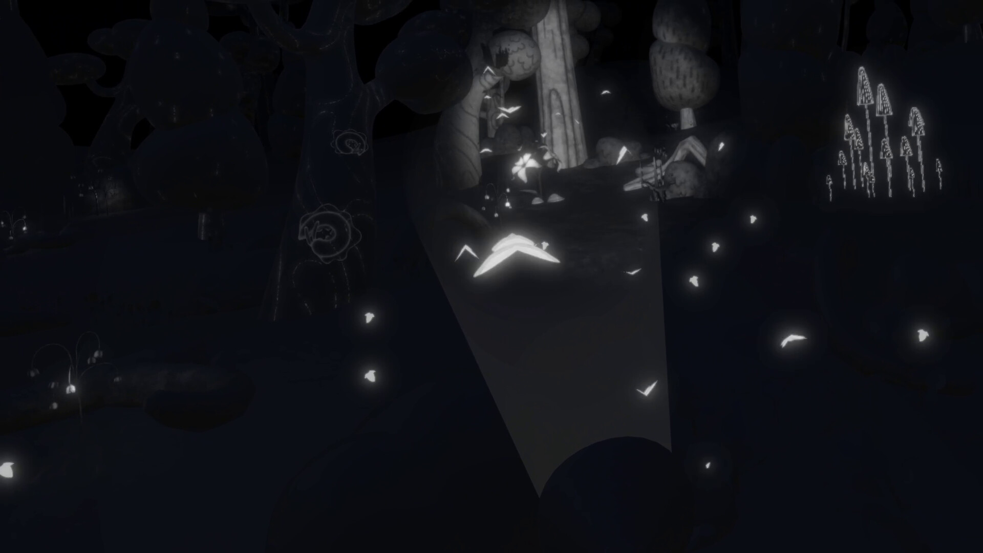 You find yourself in a dark forest only equipped with a flashlight in your hand. What you choose to illuminate slowly comes to life: drifting pollen, floating mushroom creatures, subtle movements in the trees. The forest reveals itself through your curiosity.
