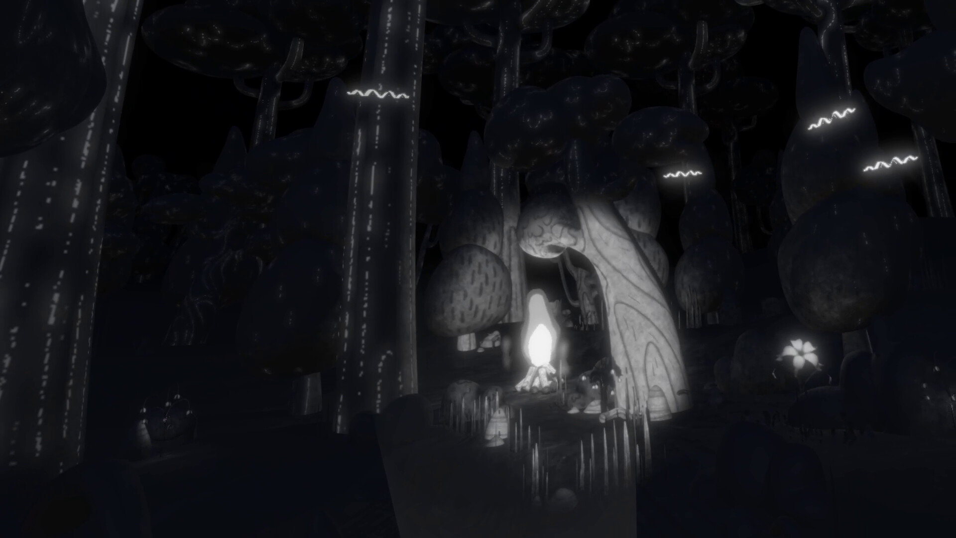 The world combines hand-drawn 2D animated creatures with a spatial 3D forest environment. The black-and-white forest gradually transforms as you explore. An evolving spatial soundscape accompanies your journey, growing richer as the world awakens around you.