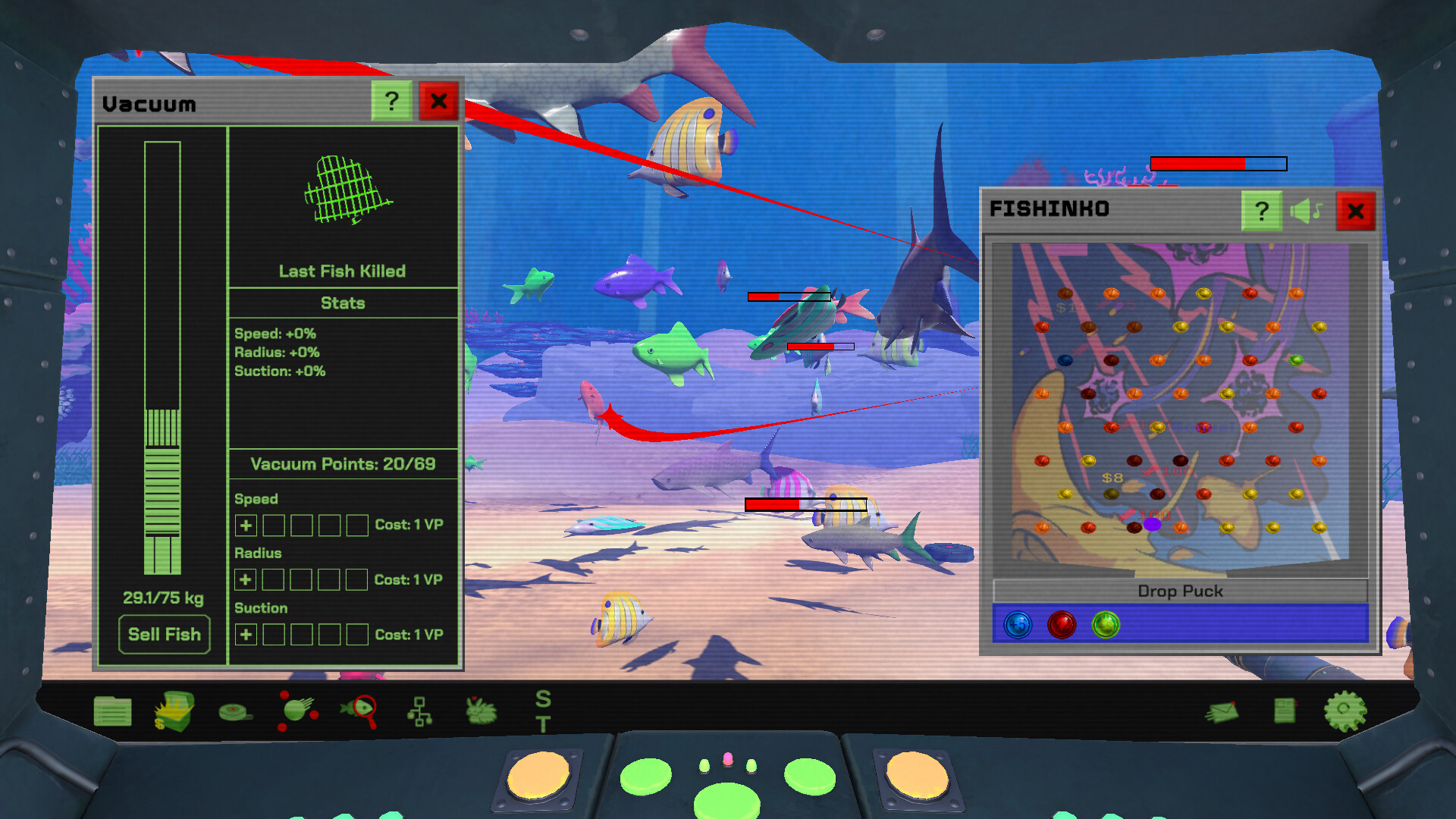 FincrementalOS is a hybrid incremental-fish-shooter and simulated operating system! Shoot down fish from the comfort of your submarine to collect and sell them on the market for money, then pour those funds back into your business to make more cash! Everything you need is easy to access in the built-in operating system, but configure carefully: The desktop is your window to the ocean, so the more windows you can see, the less fish you can shoot. Arrange your perfect desktop to optimize your fishing flow (Or just keep it all closed. Nothing’s stopping you)!
