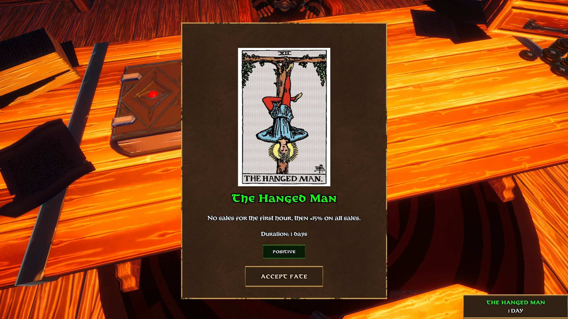 별에 길을 묻다. 신비로운 자라의 천막을 방문해 매일의 타로 점을 받아보세요. 메이저 아르카나에서 카드를 한 장 뽑아, 하루 전체를 좌우할 축복, 또는 저주, 을 받으세요. '태양'은 당신의 매출에 축복을 내릴 수도 있지만, '탑'이 나오면 진열대 위의 모든 것이 무너져 내릴지도 모릅니다.