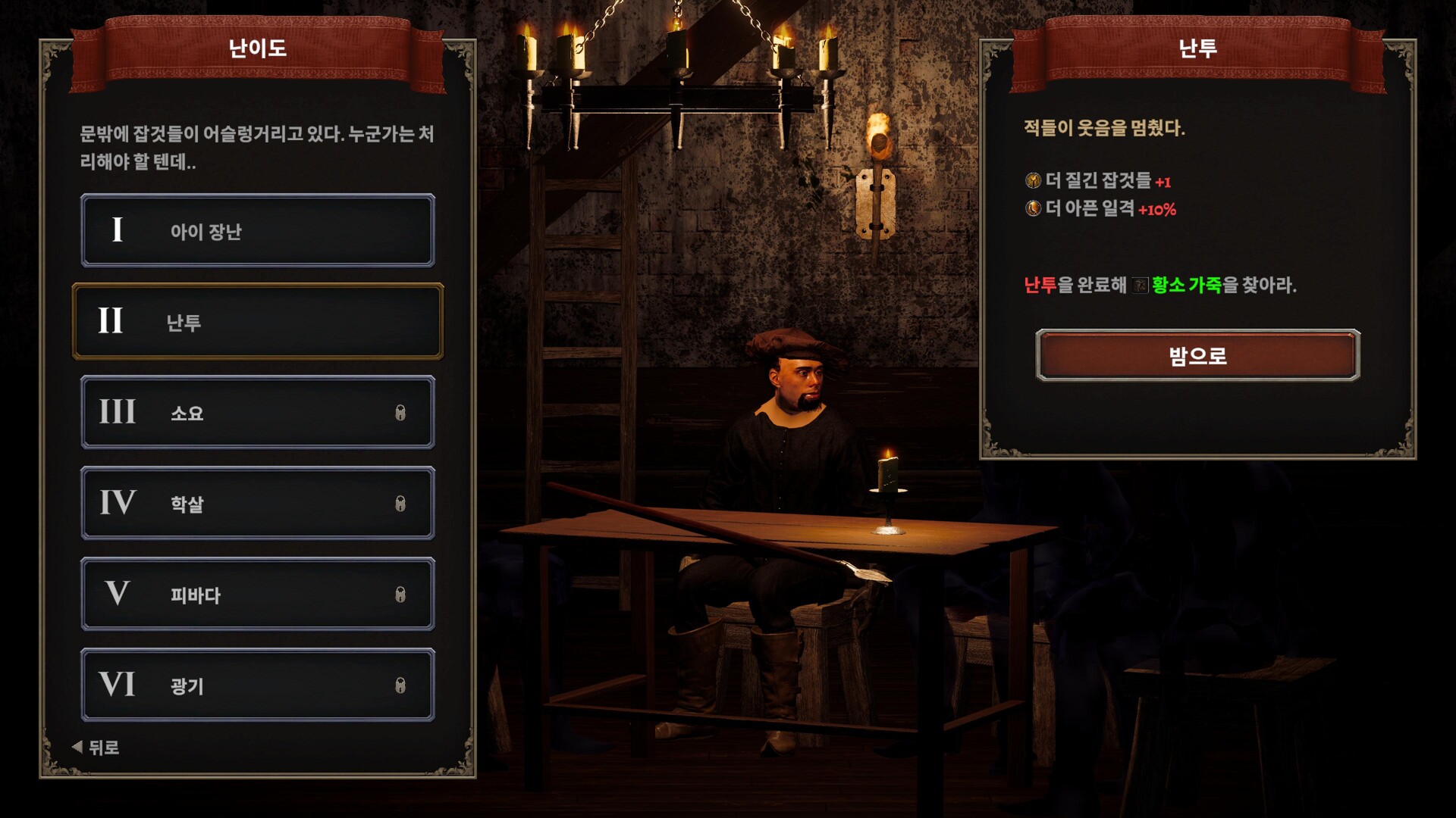밤이 깊어질수록 잡것들은 더 대담해진다 — 방랑자, 깡패, 난봉꾼, 그리고 그 사이사이에 3명의 보스가 나타나 빌드가 형편없다면 순식간에 끝장을 낸다. 6개의 난이도는 애들 장난에서 광기에 이르기까지 잡것들이 얼마나 사납게 들이치는지를 결정하고 — 그 여정 속에서 새로운 클래스와 아이템이 해금된다.