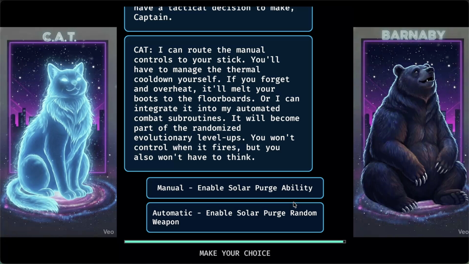Your Choices Shape the Run You aren't flying solo. Step into the paws of Barnaby, navigating the stars alongside your trusty, occasionally snarky AI companion, C.A.T. Between the frantic space battles, your choices matter and actively alter your game experience. The tactical decisions you make in dialogue drastically change how you play the game.