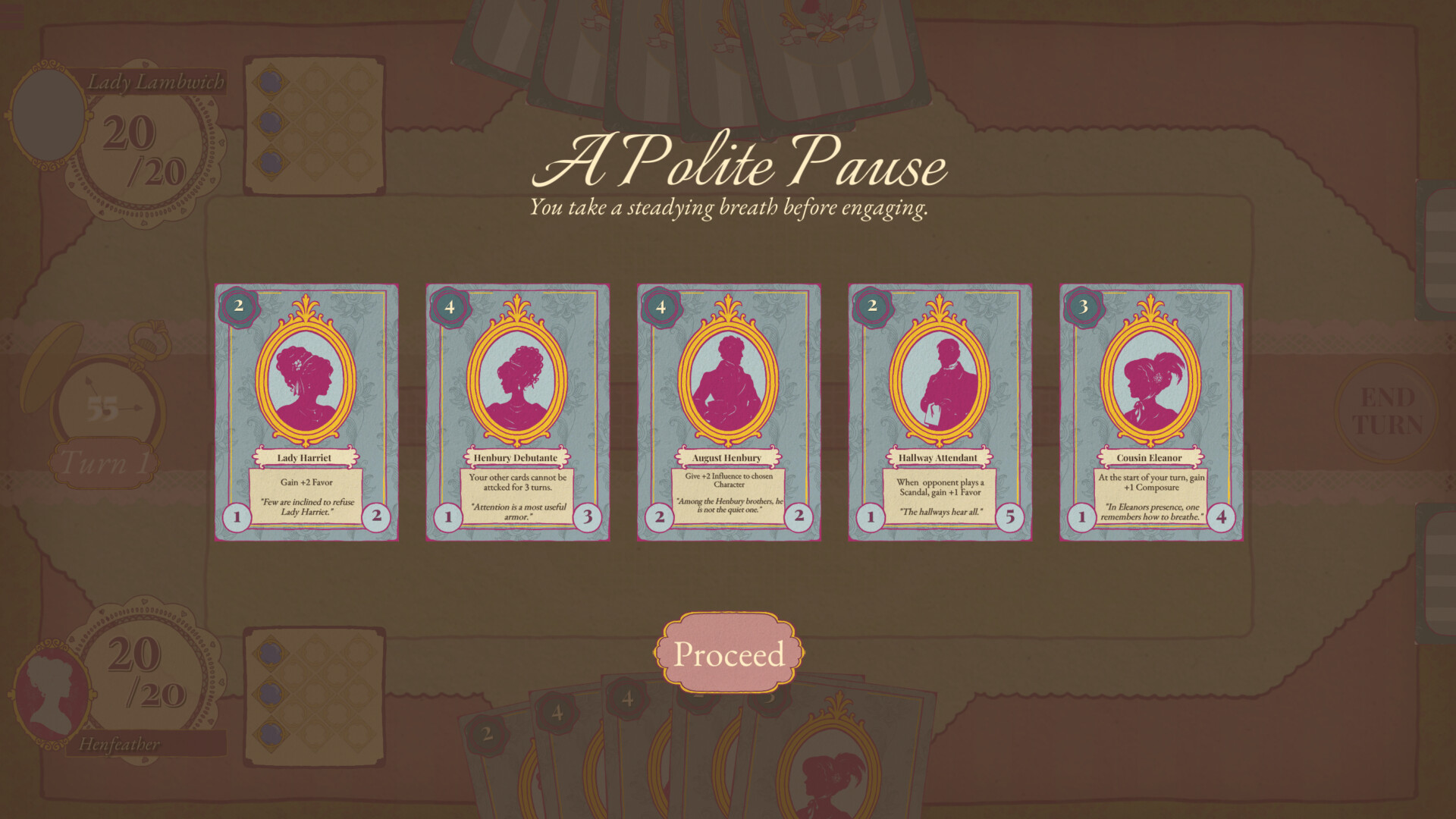 A single player game of social dueling. Forget health points, you are trying to keep your Composure. Use Influence to "attack" your opponent's social standing. Spend Favor to play your cards.