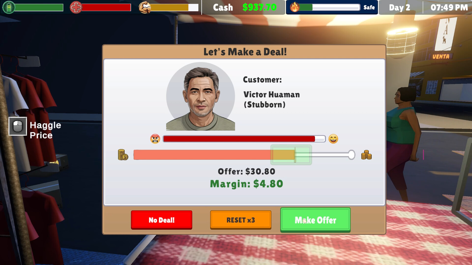 Every customer has a budget—price your goods wisely, offer deals to attract shoppers, and master the art of bargaining to thrive in the bustling streets of Gamarra!