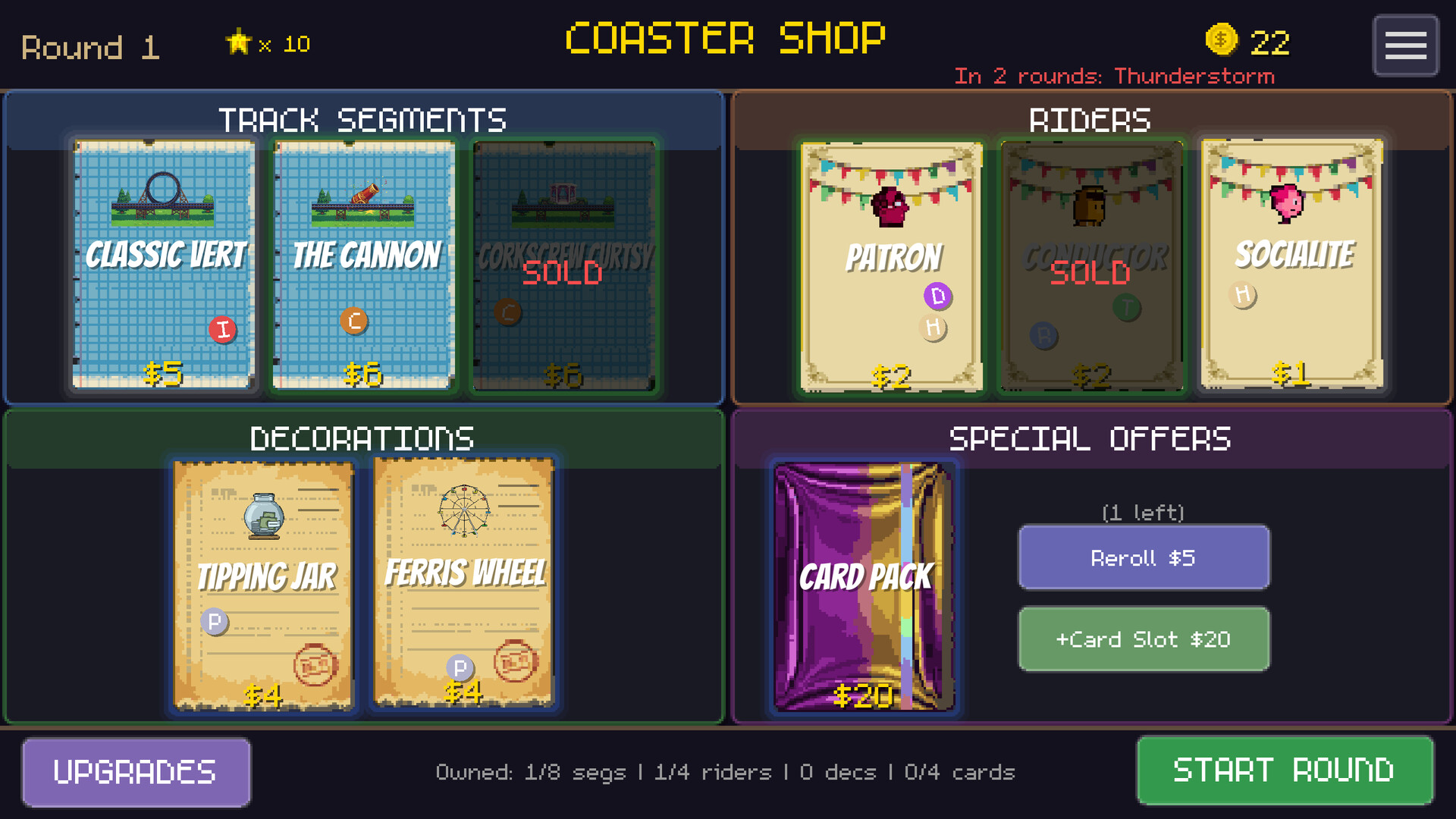 Each run is 12 rounds of escalating goals. Meet the thrill target, keep your riders happy, and don't lose all your stars. Every third round, a boss modifier changes the rules: bigger requirements, new constraints, and a reward for winning. Make it to the end of Round 12 and you've built something special.