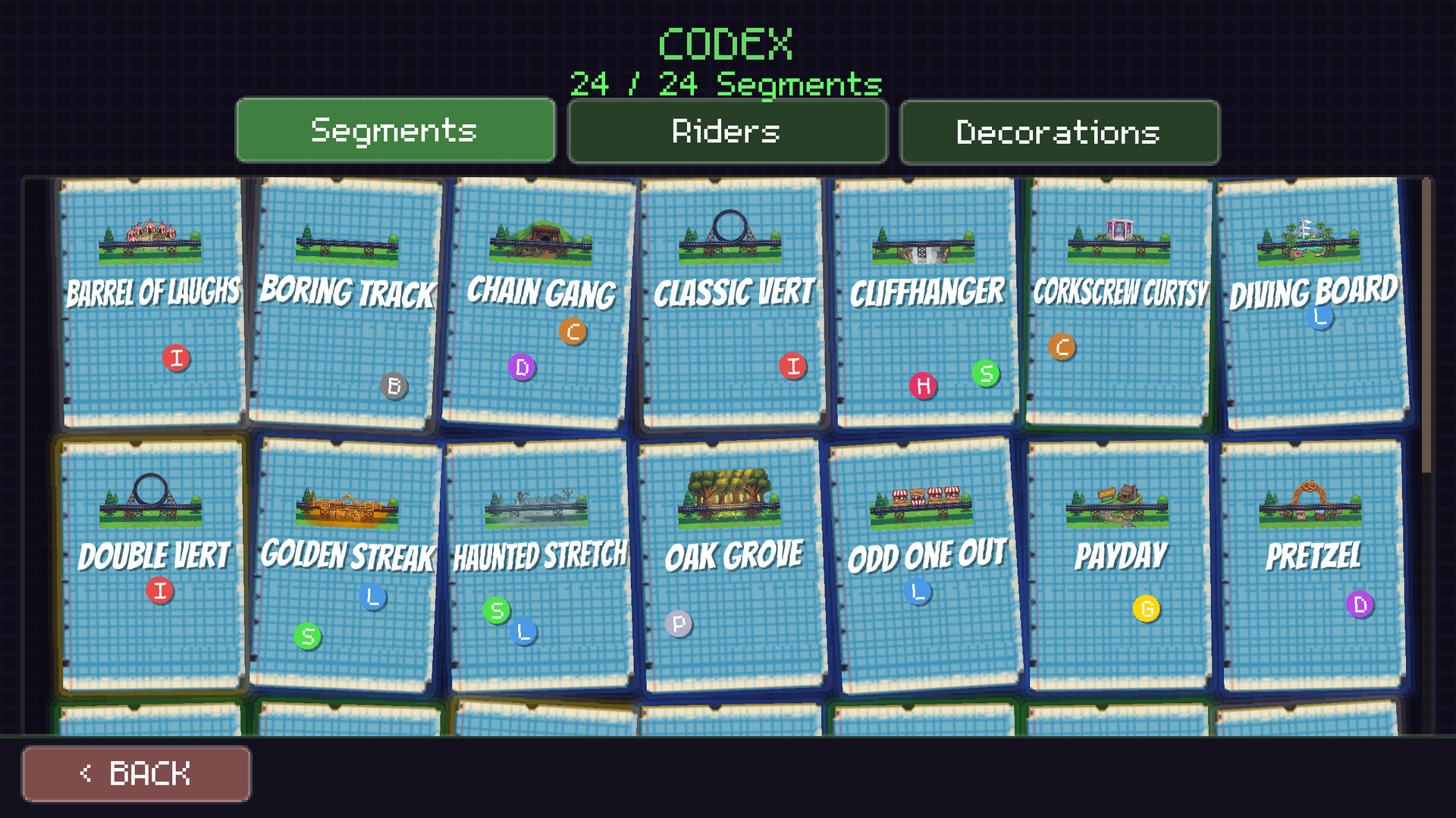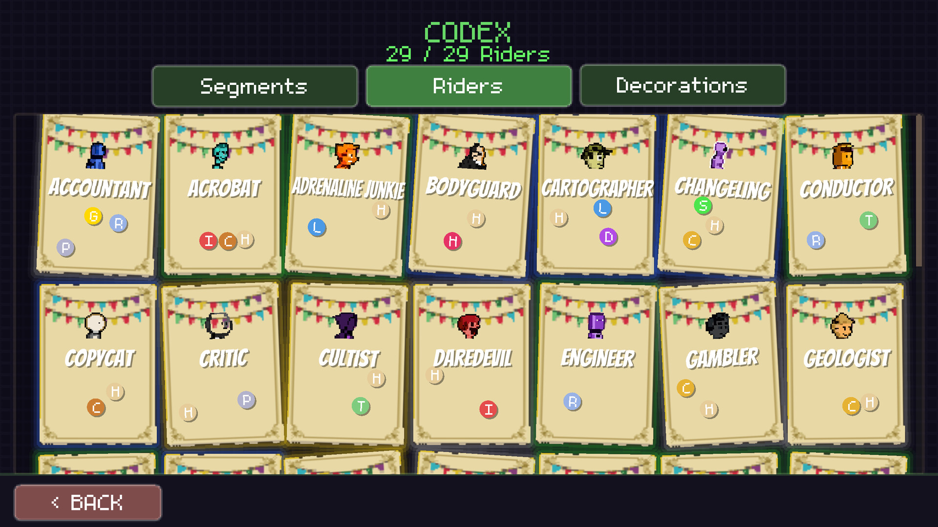 Fill your train with any of the 29 waiting riders, each with their own personality, synergies, and scoring quirks. The Gambler has a 20% chance to triple their score (or nothing). The Dare Devil loves inversions. The Conductor is a robot rider that is more thrilled the longer the train gets. Matching the right riders to the right track is how the big numbers happen.
