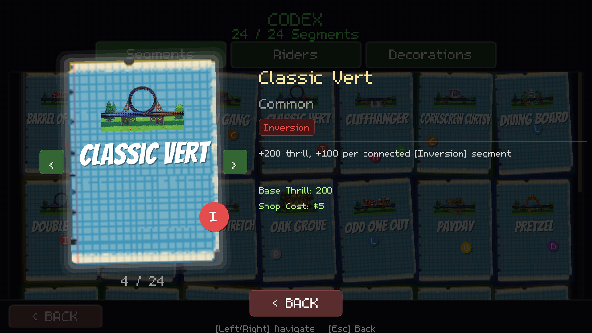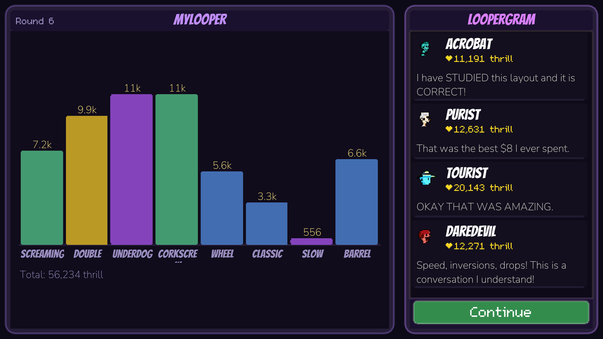 Between rounds, you browse a rotating market of track segments, eccentric riders, and decorations. Then watch your choices play out as your coaster loops endlessly, stacking thrill multipliers and generating increasingly unhinged reactions from your passengers.