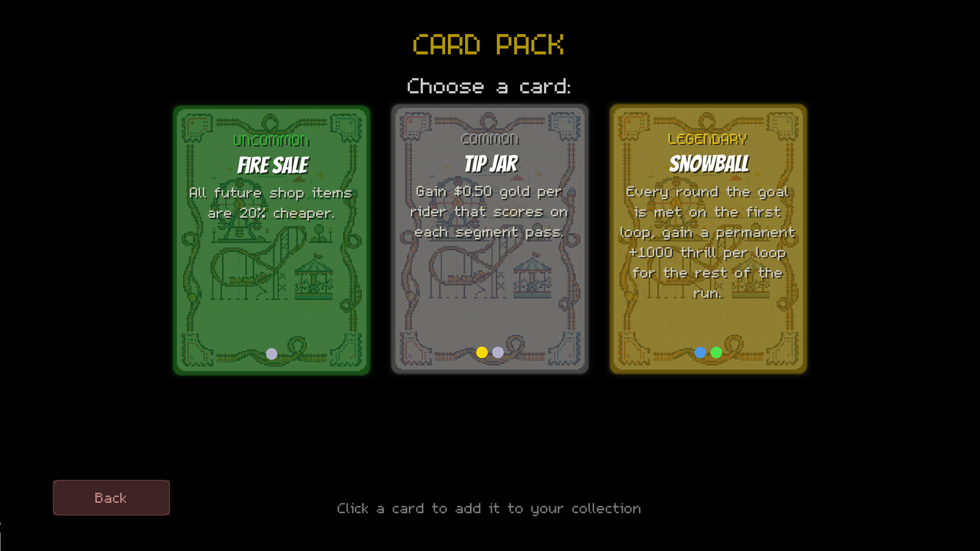 Discover and activate card modifiers that bend the rules across an entire run. Boost specific rider types, unlock combo chains, multiply thrill in exponential ways. Card packs game changing but expensive, crack them open and adapt your strategy on the fly.