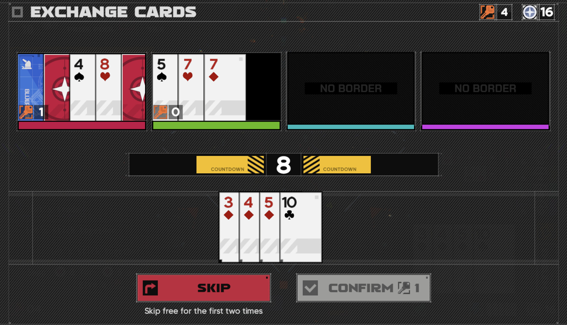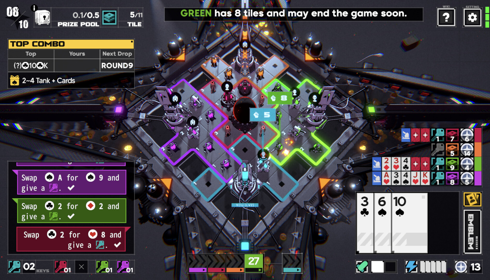 입찰, 카드 교환, 전투 단계가 계속해서 판세를 바꾸는 라운드를 헤쳐 나가세요.