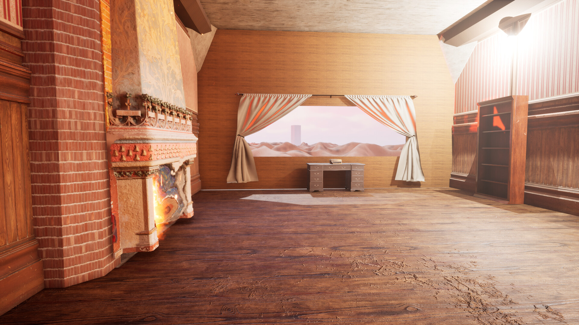 A library in the desert. A window looking out at a dark tower in the distance. Here, you write your mantra. The thing