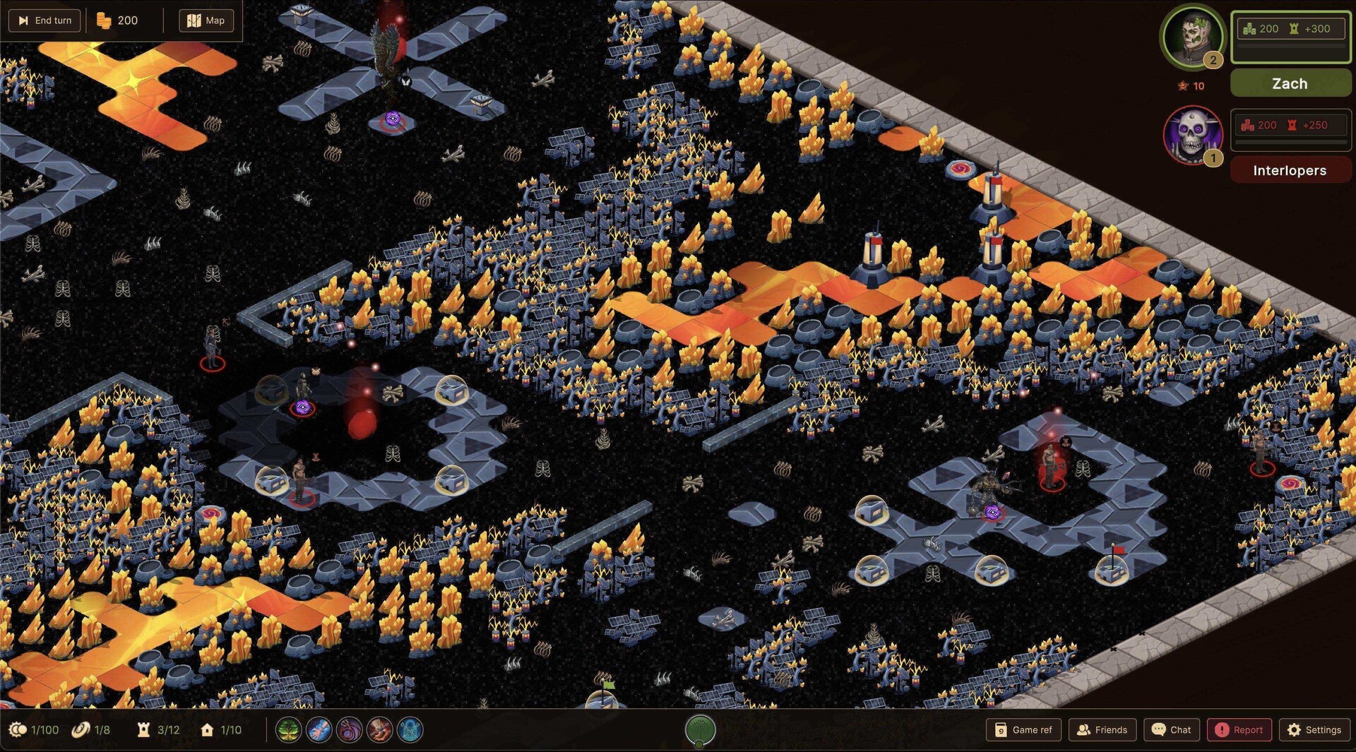 Gain mana each turn by controlling structures like villages, towers, and portals. Use that mana to summon units in tiered order, build your composition, and outmaneuver opponents on a tile-based battlefield.