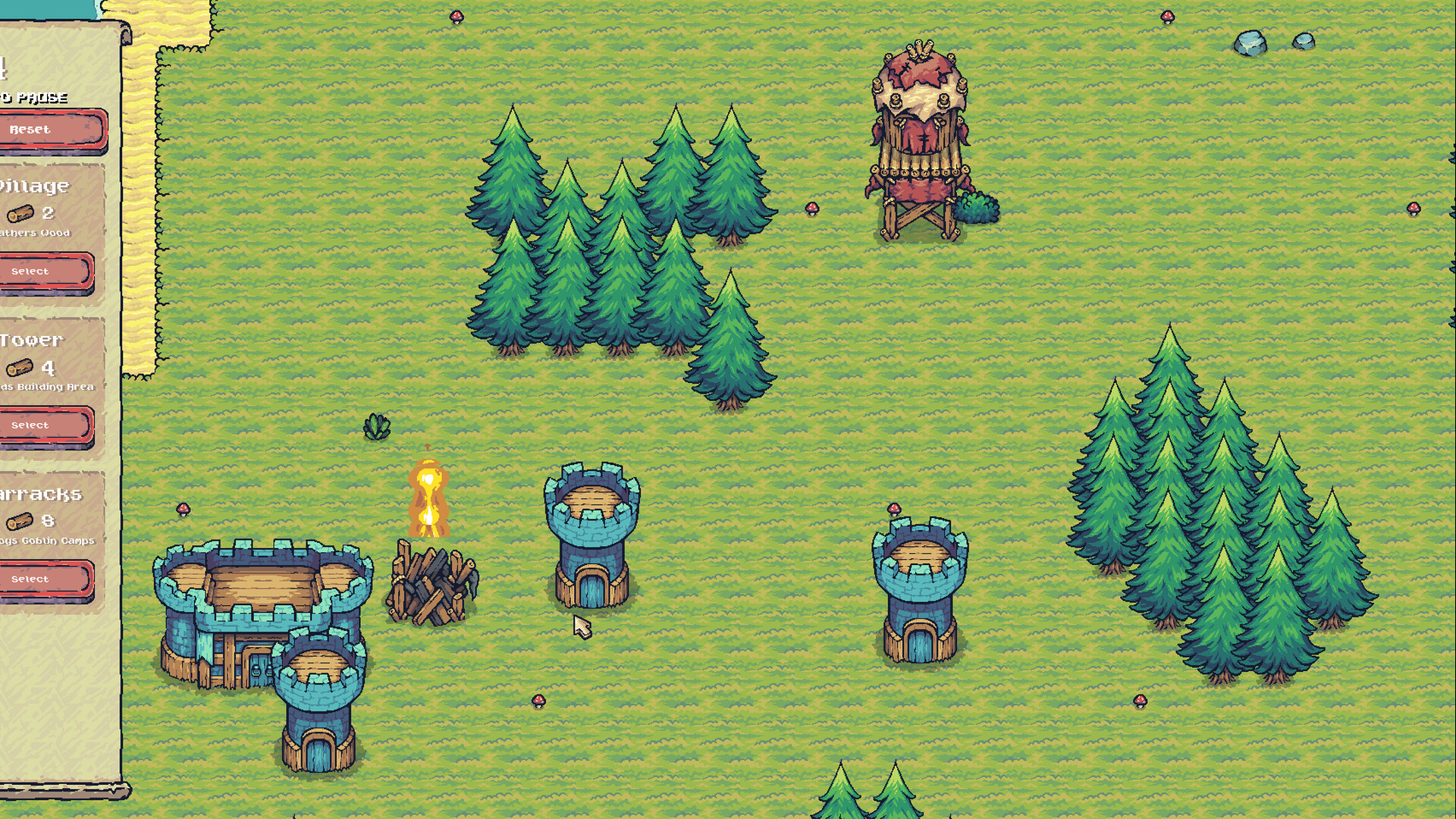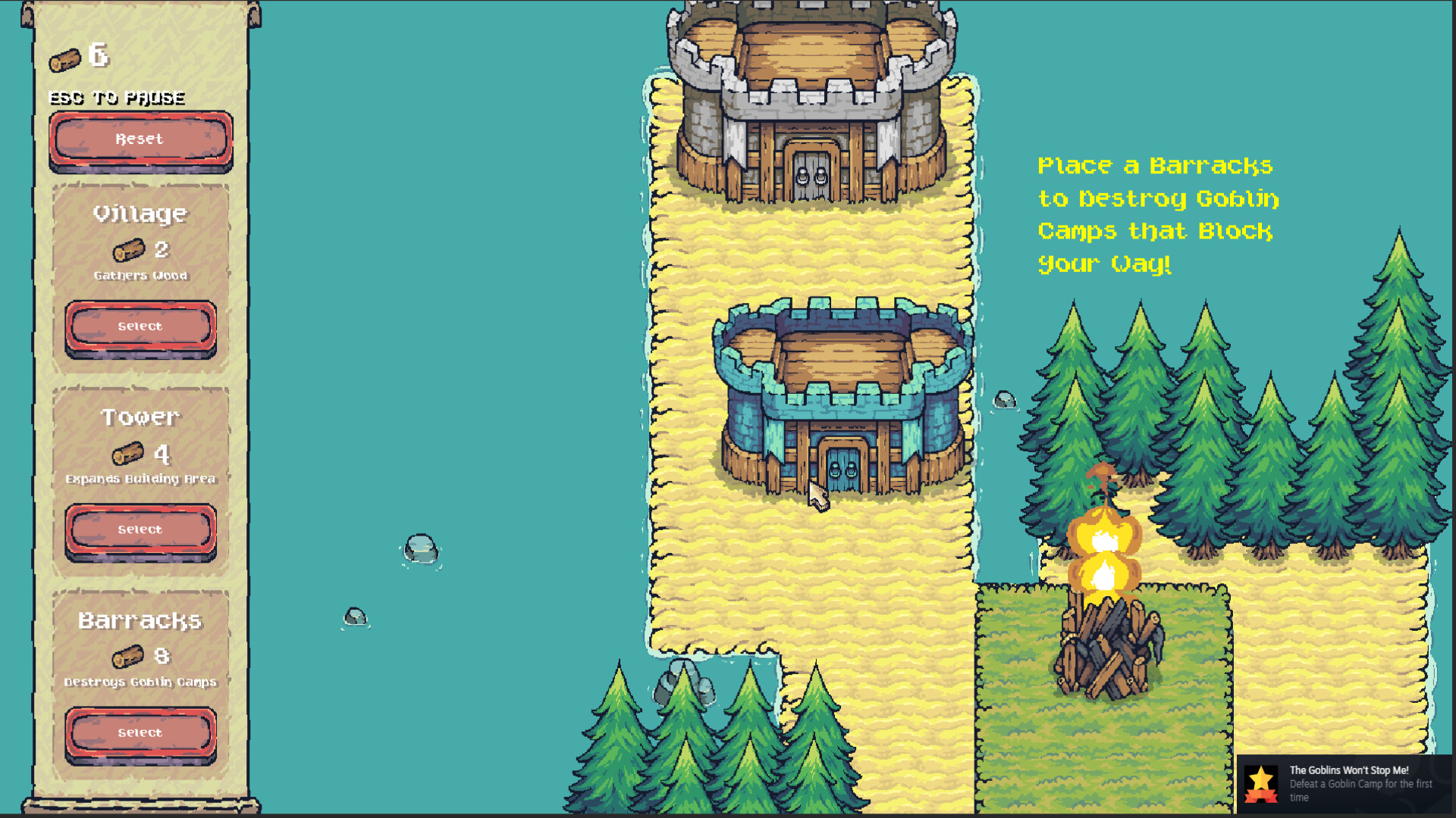 Every level starts with your main base. From there, build villages within your reach radius to harvest nearby trees and bank resources. Spend those resources on towers to push your build radius further across the map. Watch out for goblin camps — they block construction in their territory until you build a barracks and drive them out.