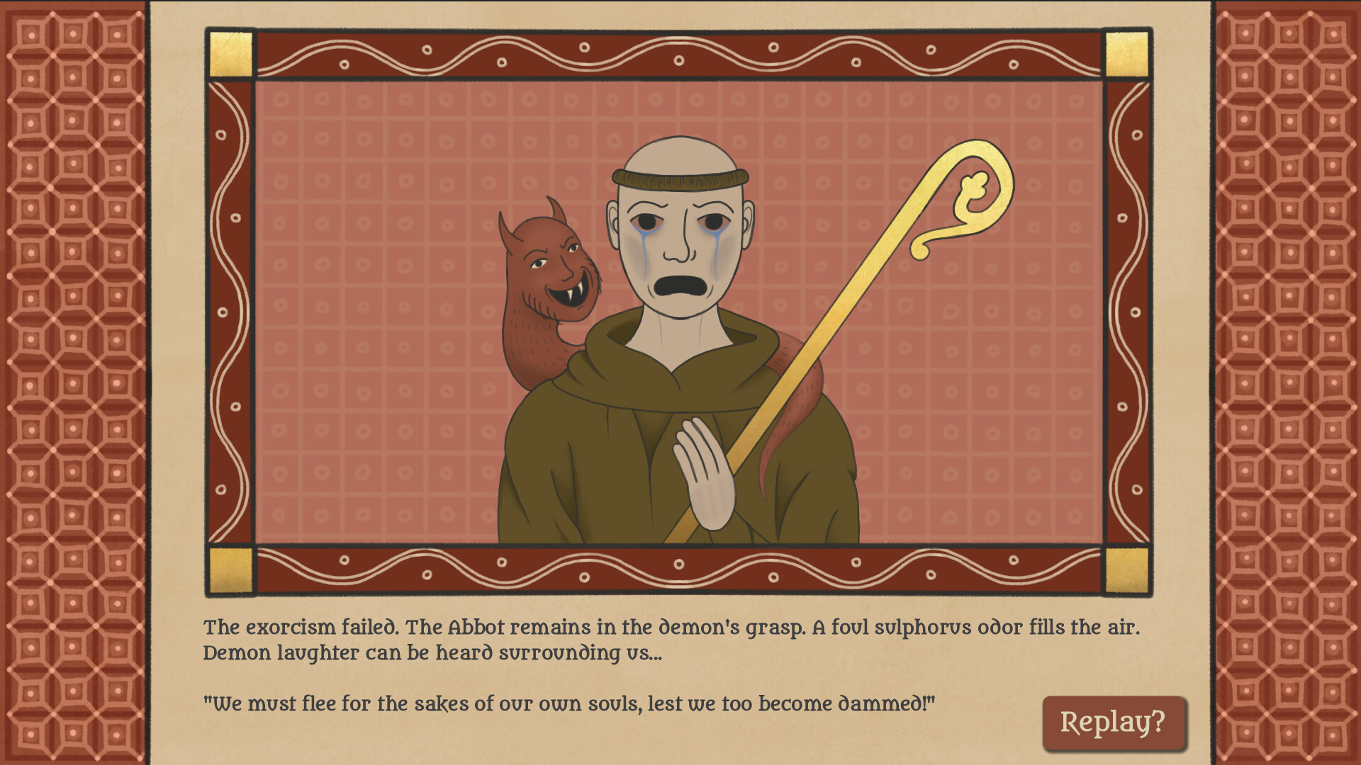 Playing as either a nun or monk, you'll travel around medieval England searching for demons, curing possessed peasants and trying to free the Abbot's soul. In order to exorcise demons you'll need to correctly identify which sigils to use and then draw them correctly before the time runs out!