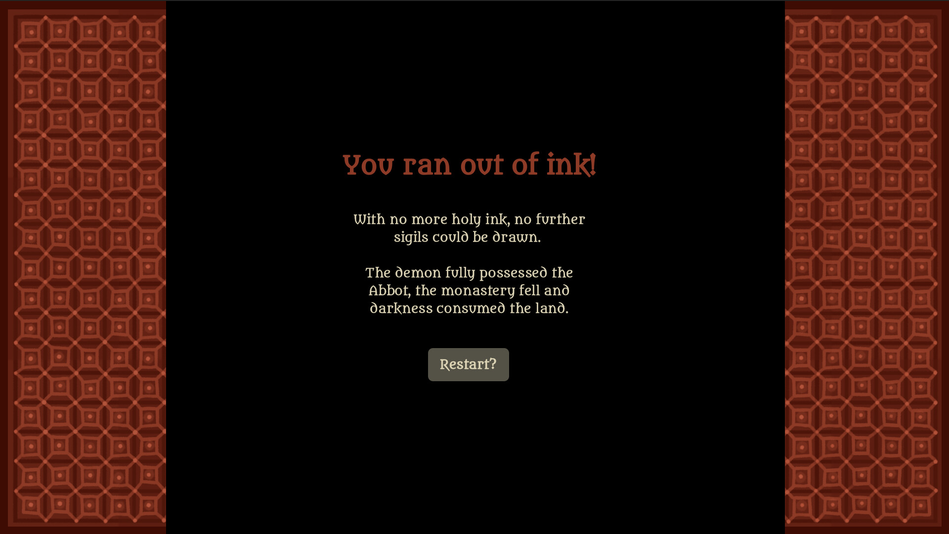 This game is a spooky drawing challenge with surprising strategic depths. Will you prioritise knowledge and risk running out of ink at the last minute, or will you conserve your resources and risk not knowing enough? There may be multiple different endings to find, can you collect them all?