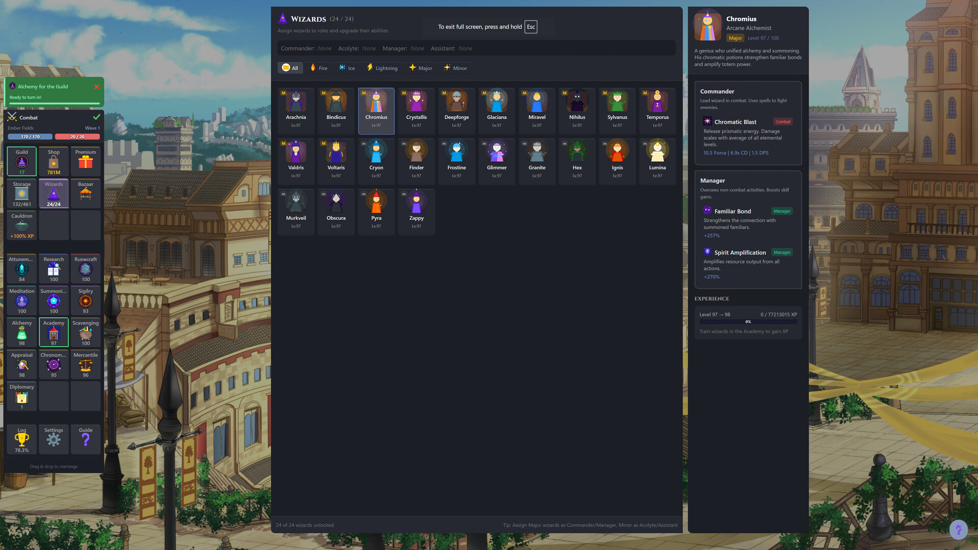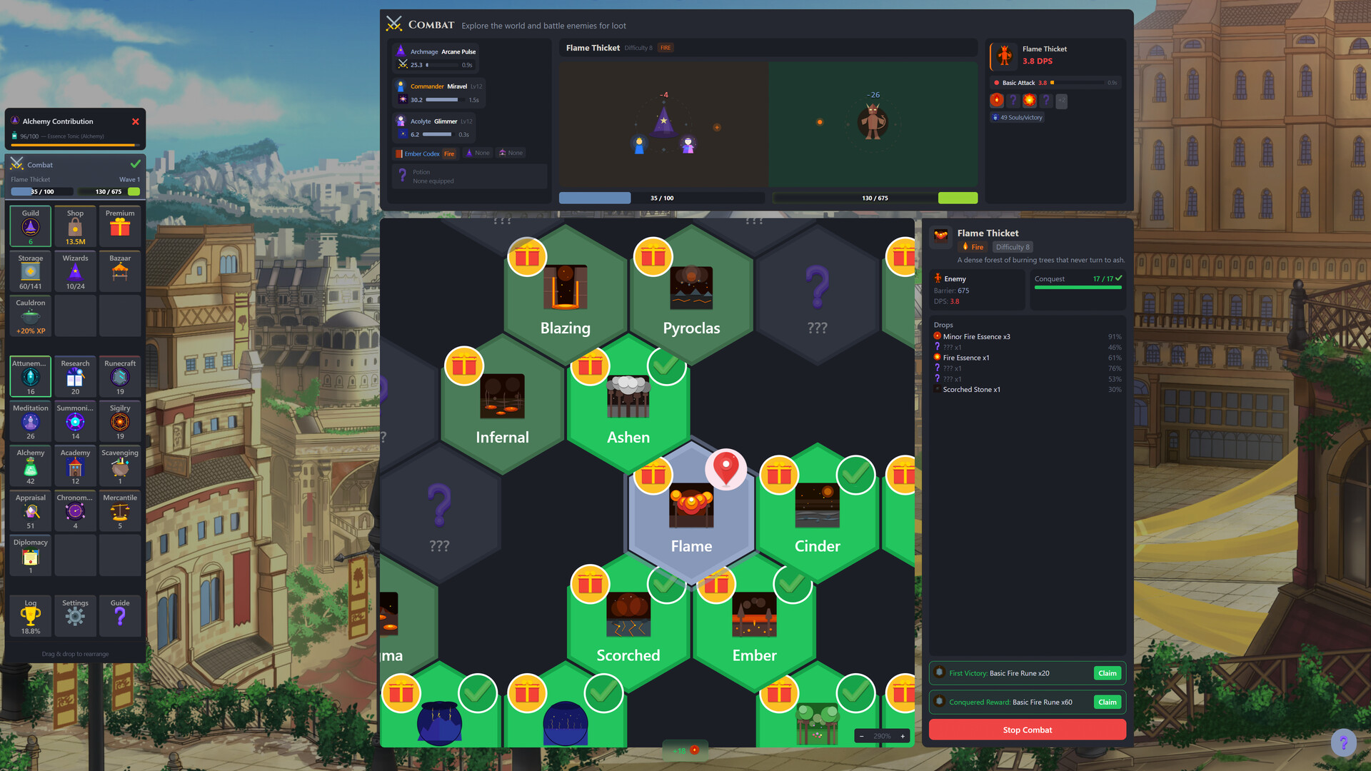 An idle/incremental RPG with deeply interconnected skills. Your skills feed the frontlines: Attunement, Summoning, and Sigilry power your wizards as they fight across an elemental hex map. Your skills feed the supply lines: Research, Runecrafting, Alchemy, Mercantile, and Scavenging keep the resources flowing. And skills you won't find anywhere else, like Chronomancy, Diplomacy, and Appraisal, tie it all together.
