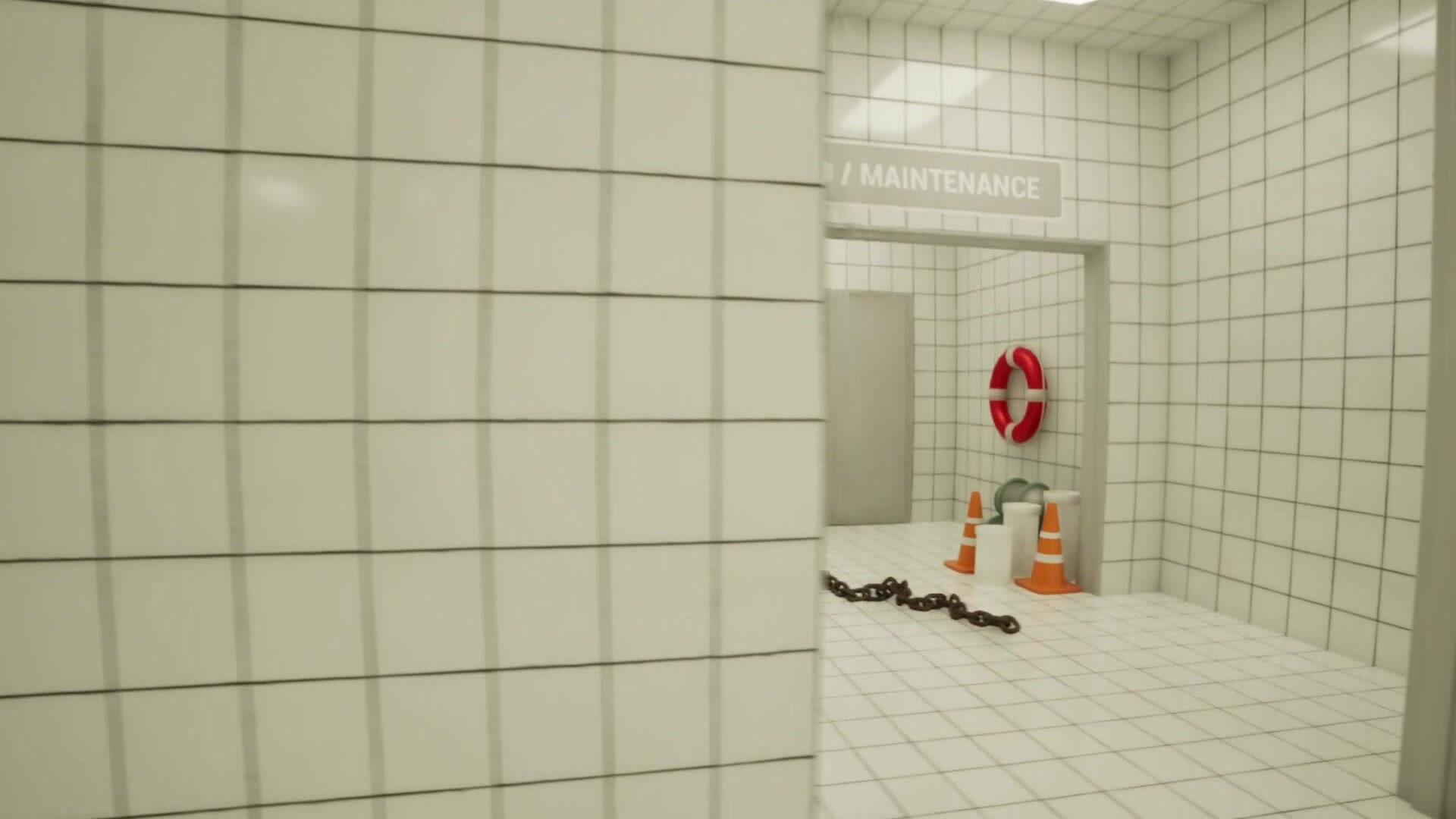 반복되는 타일 복도를 걸으며 제자리에 있지 않은 것들을 찾아보세요.