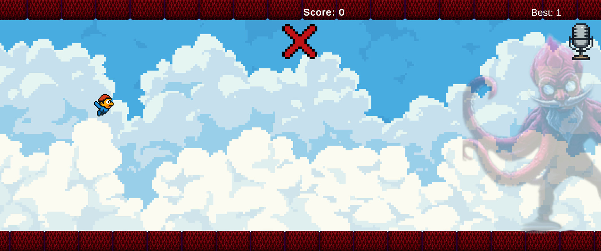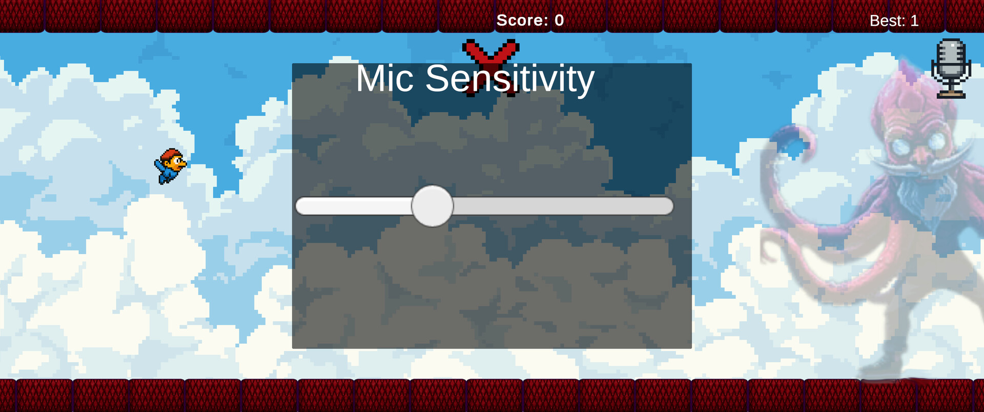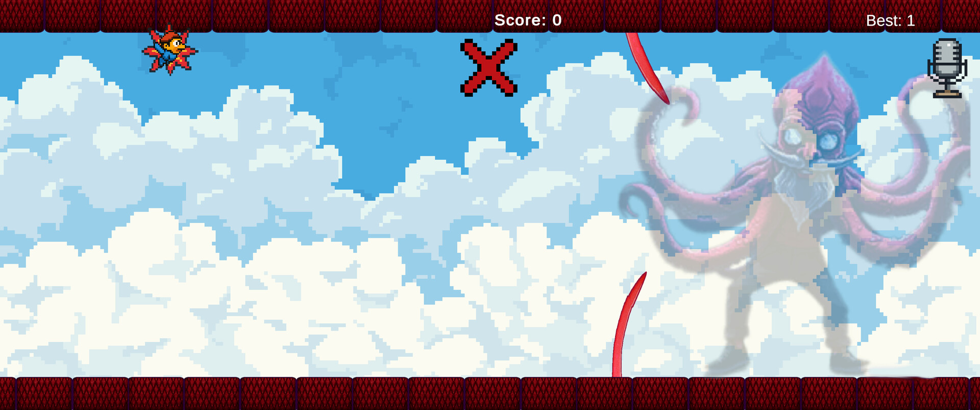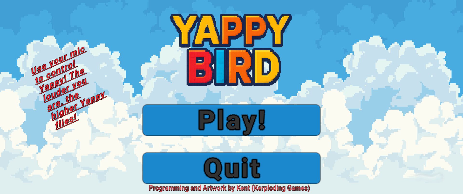 This game solely uses your microphone to control how high Yappy flies. Avoid the oncoming tentacles and use the volume of whatever sound you choose, to navigate the course and set your best score! Brag to your friends, or don't, I'm not your supervisor.
