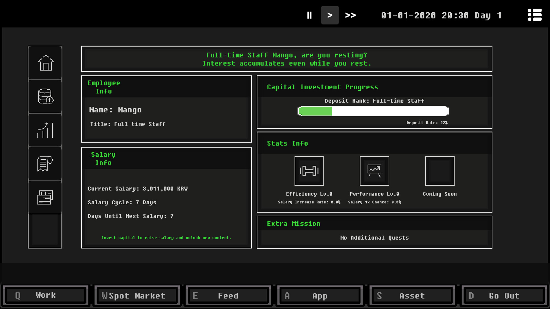 역량 강화: 번 돈을 자신의 스킬에 투자하세요. 급여 효율을 높이고 '급여 크리티컬' 같은 패시브 스킬을 강화하여 매매 외적으로도 수익을 극대화할 수 있습니다.