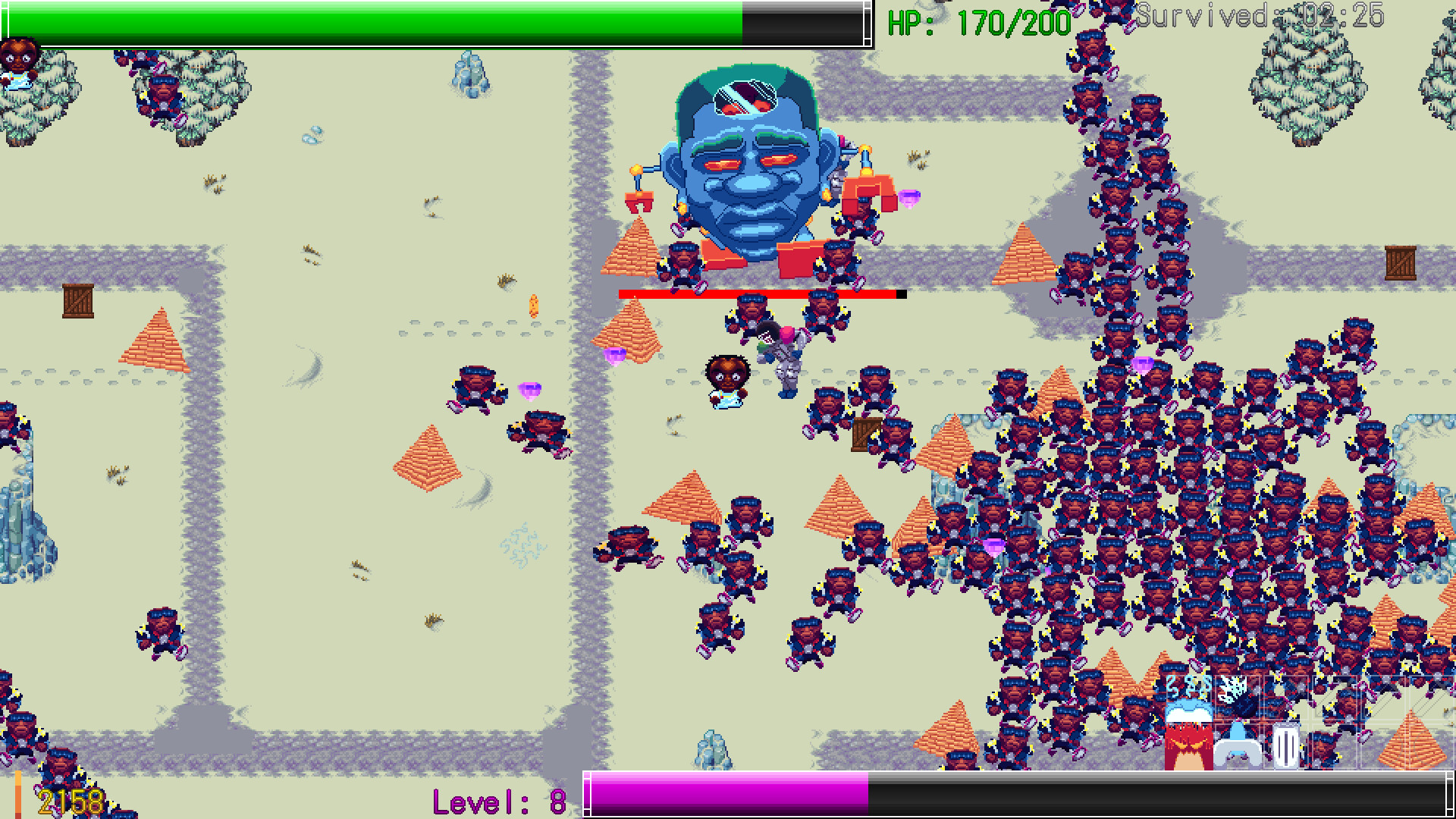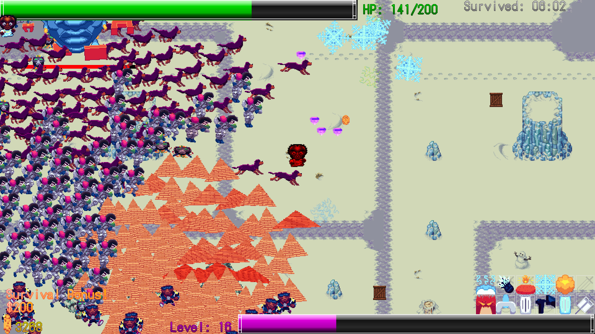 Start each run with a single weapon and expand your loadout as you level up. Mix and match from 13 weapons including a brain-wave pulse, a blunderbuss, homing light missiles, a sound-wave storm, a blizzard vortex, mustard gas clouds, and a spinning UFO alongside 12 stackable passive upgrades that push your firepower, survivability, and mobility to the limit.