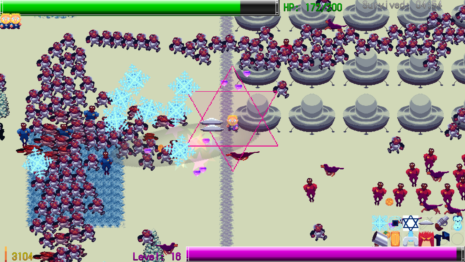 Choose from a cast of distinct characters, each with their own starting weapon, stat profile, and playstyle. Yakub the scientist, Ashtar Sheran the cosmic commander, Kash Patel the ascended warrior, and an Adélie Penguin, a very curious bird who found a portal to Agartha past the ice walls of Antarctica, are all available to unlock and master.
