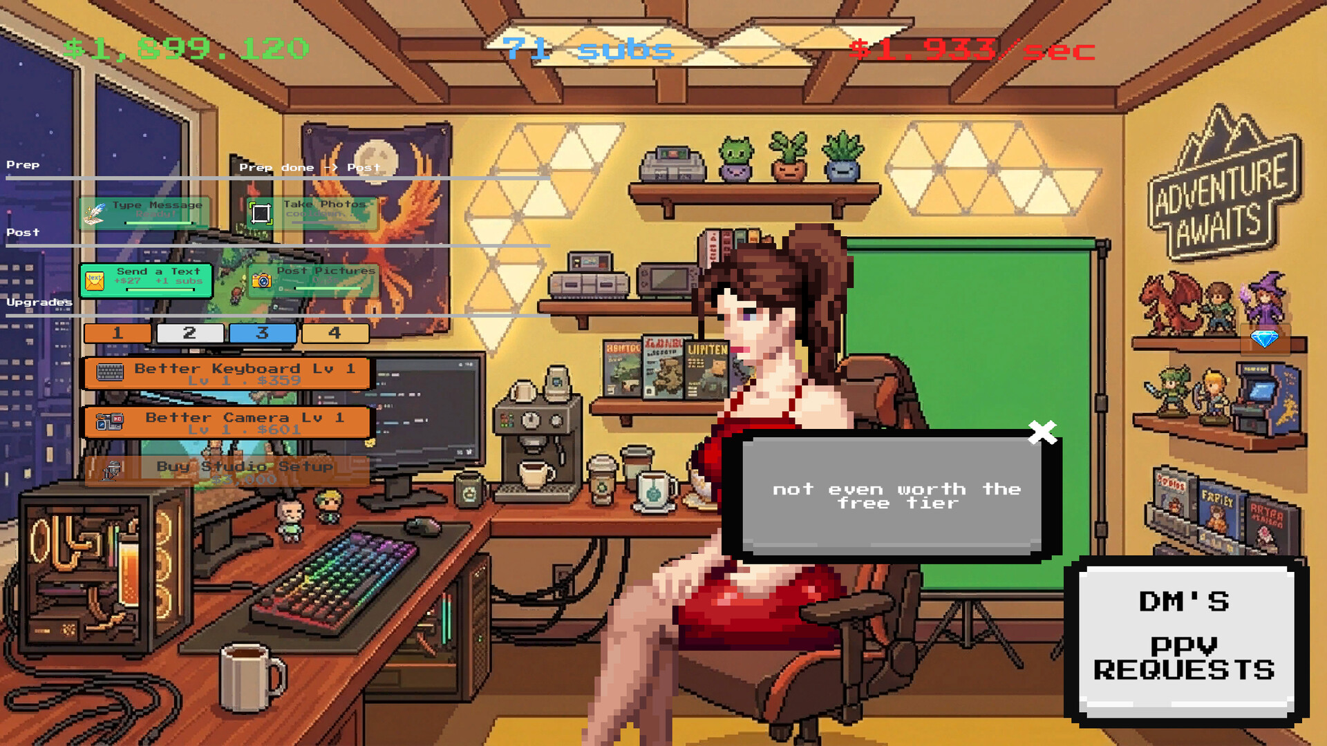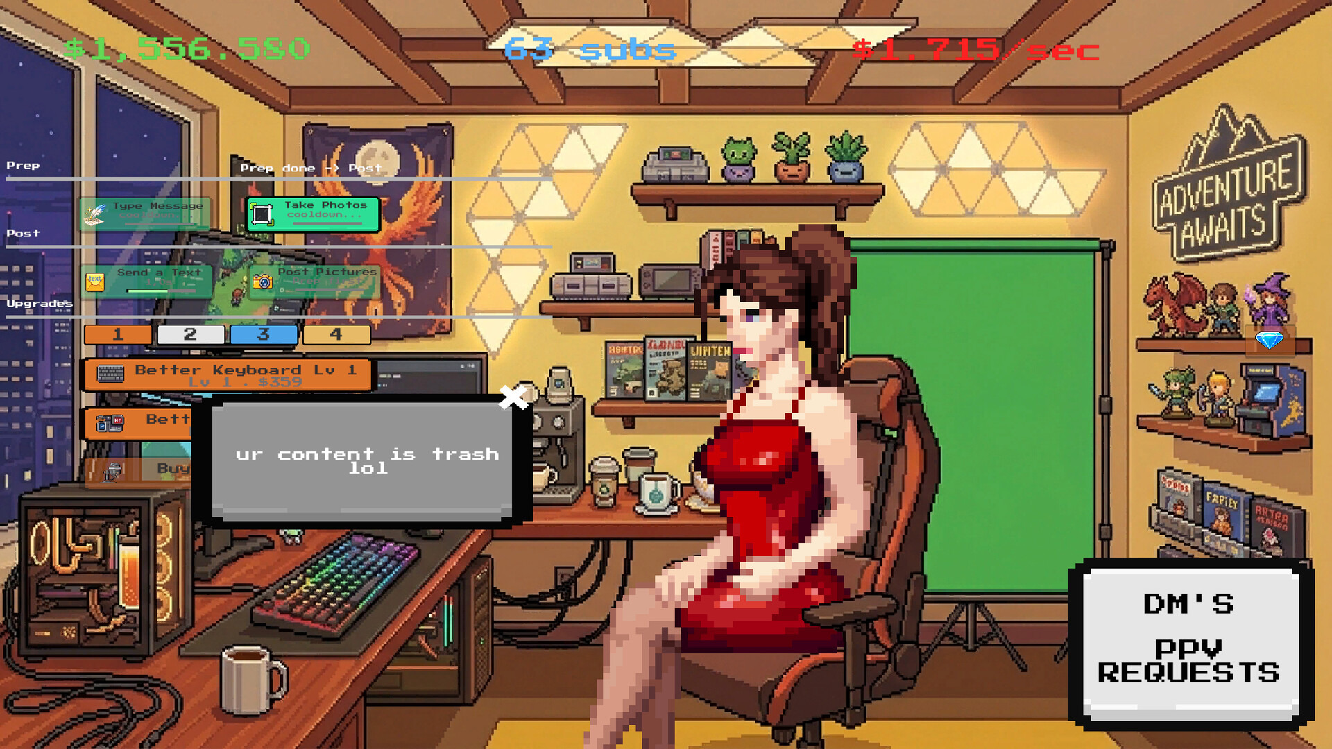 Start with nothing and upgrade your equipment, cooldowns, and payout rates. Monitor your Subscribers and Income per Second to optimize your path to the top. Are you ready to embrace the spicy side of the internet?