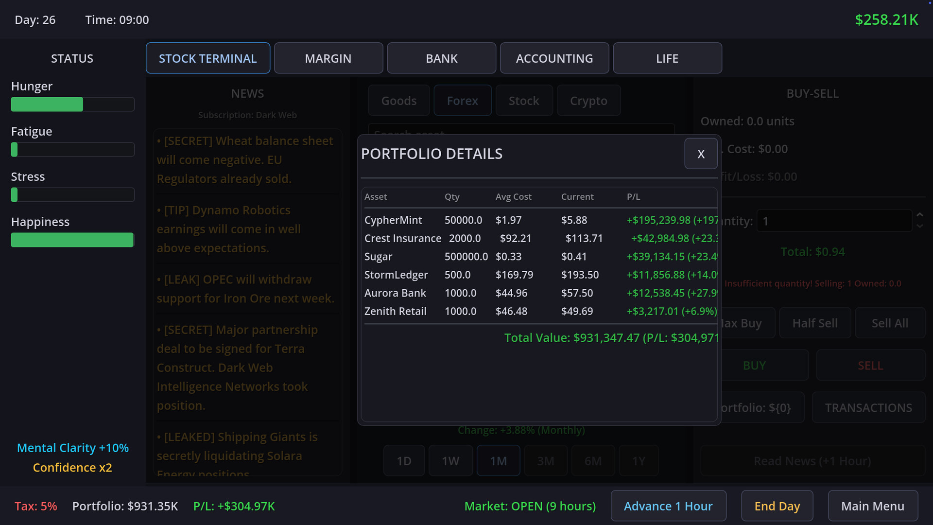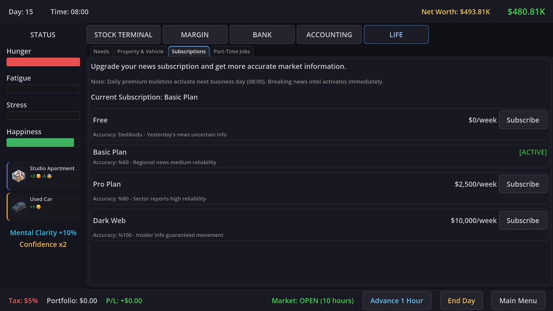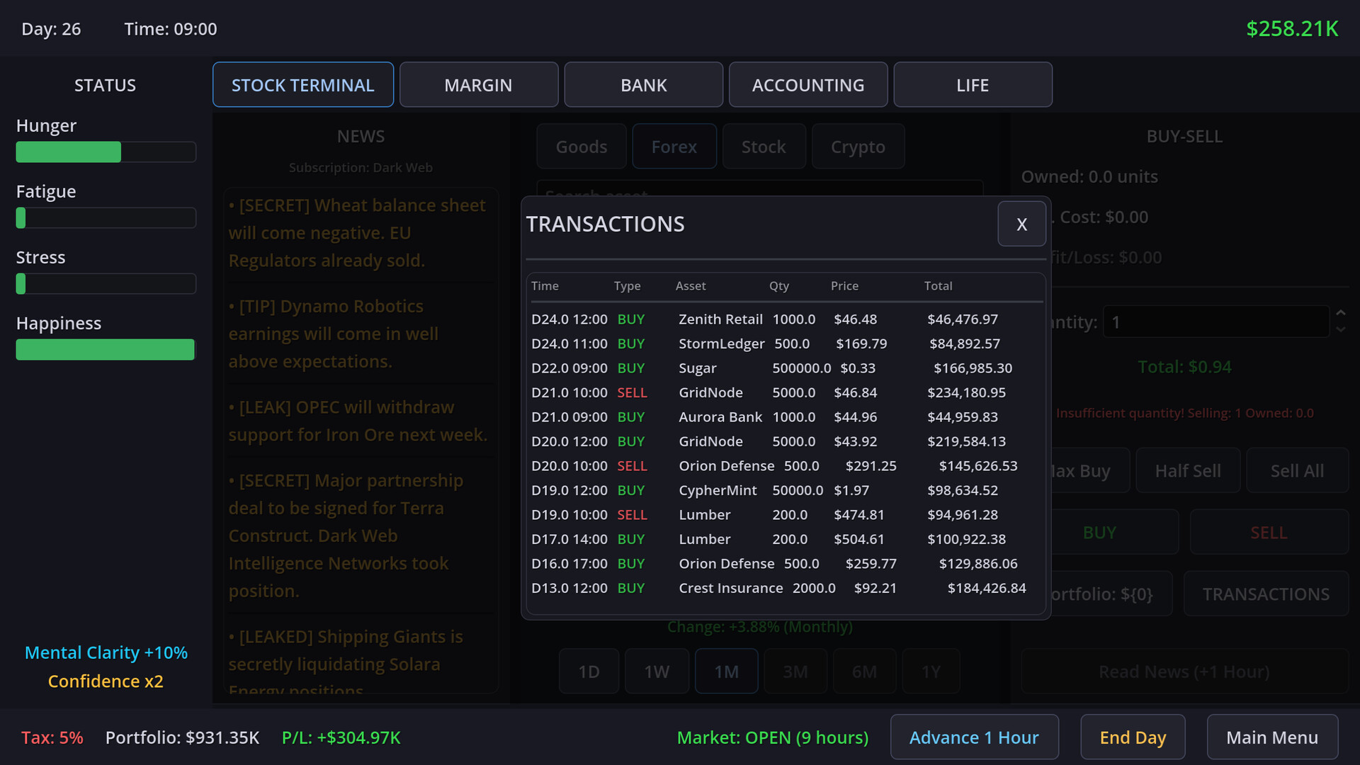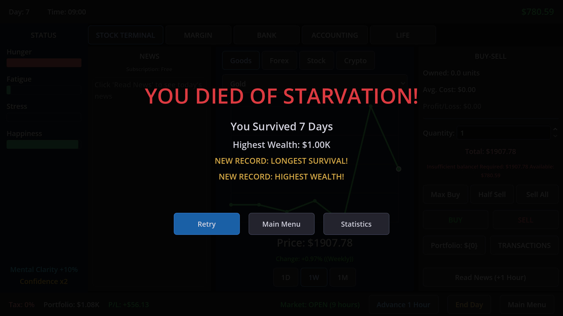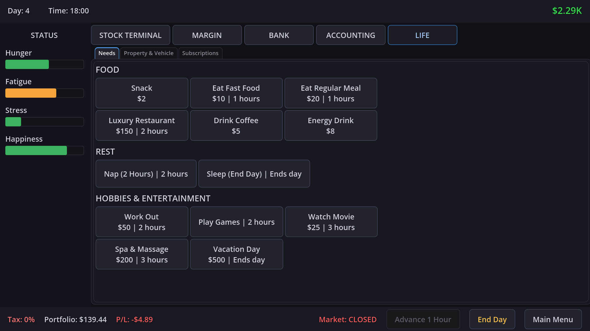 Trading isn't just about reading charts; it's about staying alive. You must carefully manage your 4 core lifelines: Hunger, Fatigue, Stress, and Happiness. Miss a meal to afford a stock? Your health deteriorates. Lose a trade? Your stress levels spike. Balance your biological needs with your financial ambitions before your body goes bankrupt.