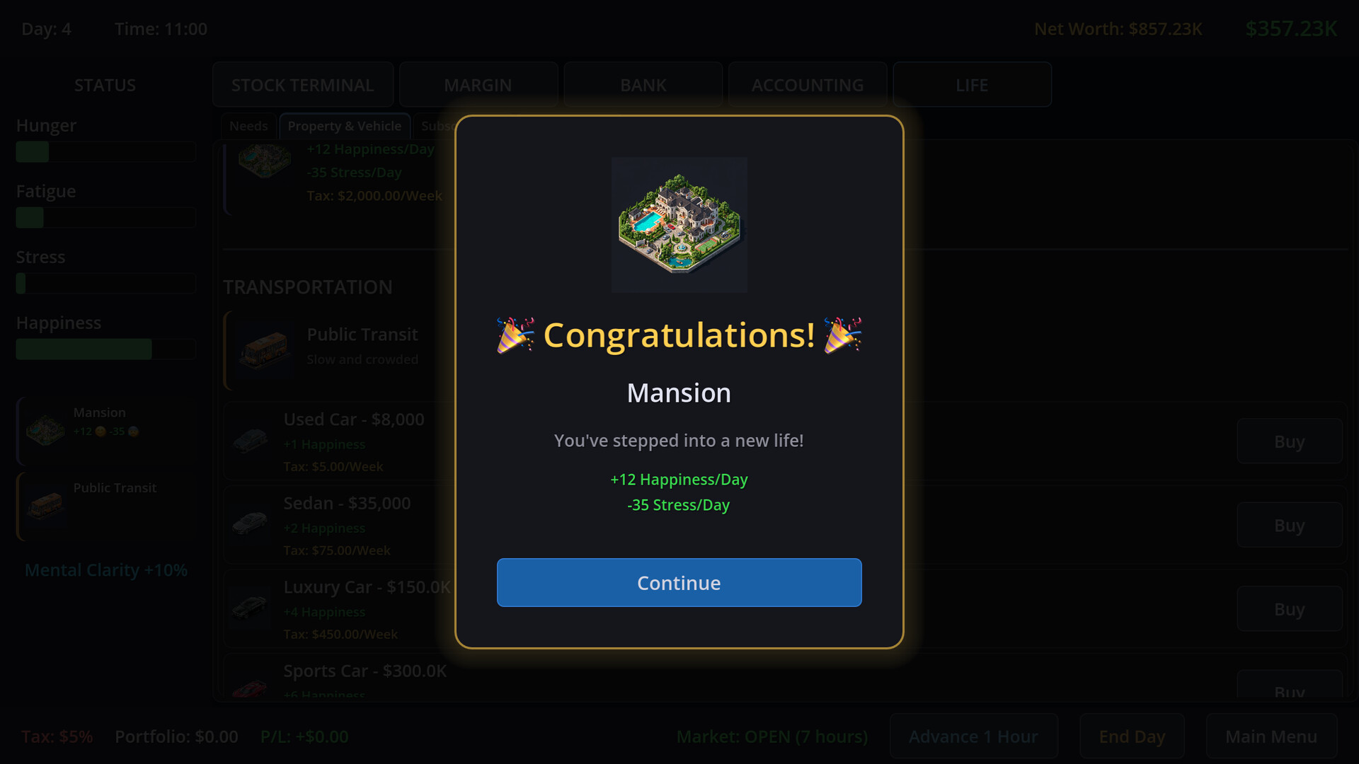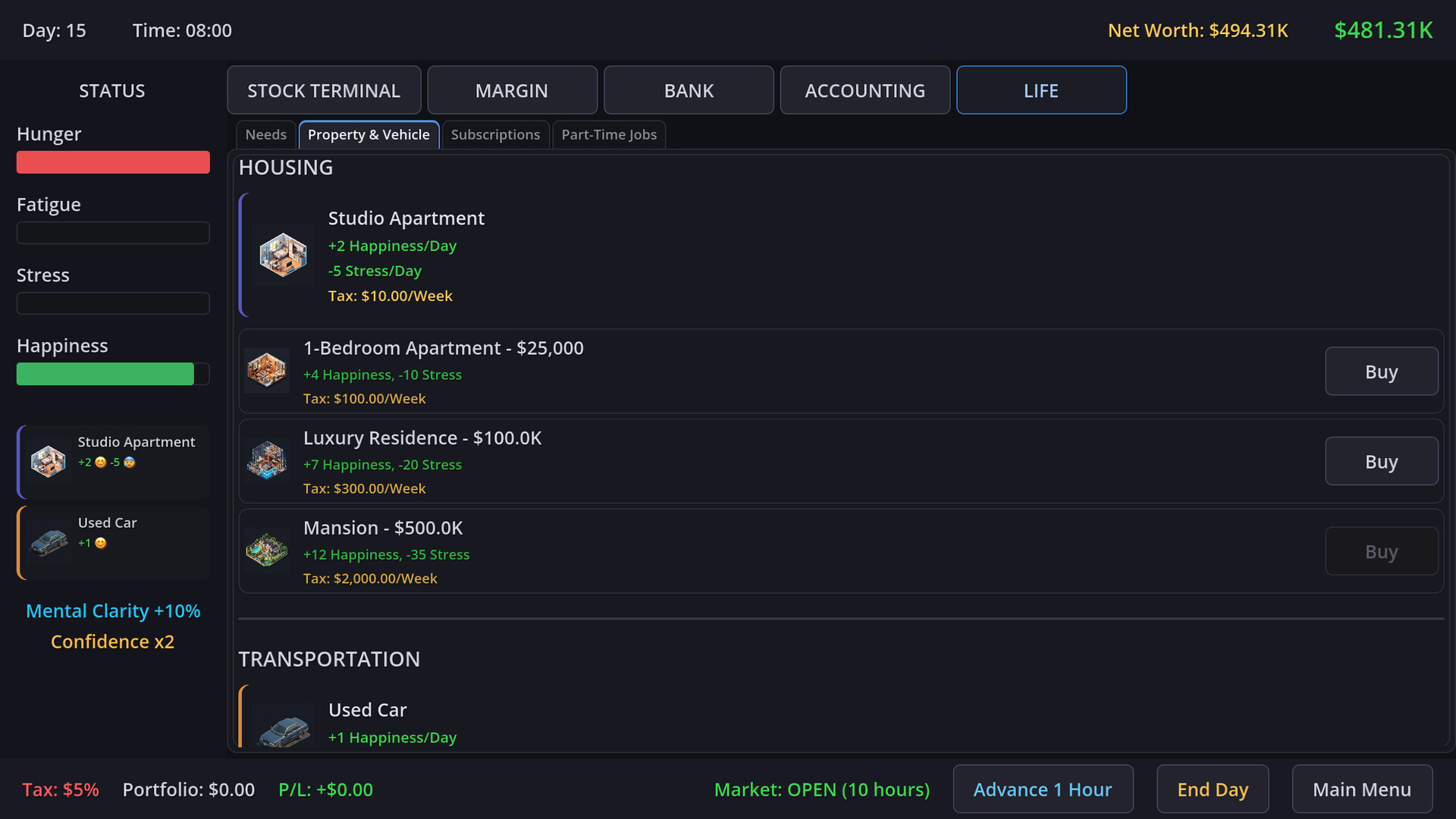 You won't start at the top. When the market is closed or you are completely broke, swallow your pride and take on part-time jobs to survive the night. Use your hard-earned profits to unlock lifestyle upgrades like better houses and cars, which will passively help manage your daily stats and keep your stress at bay.