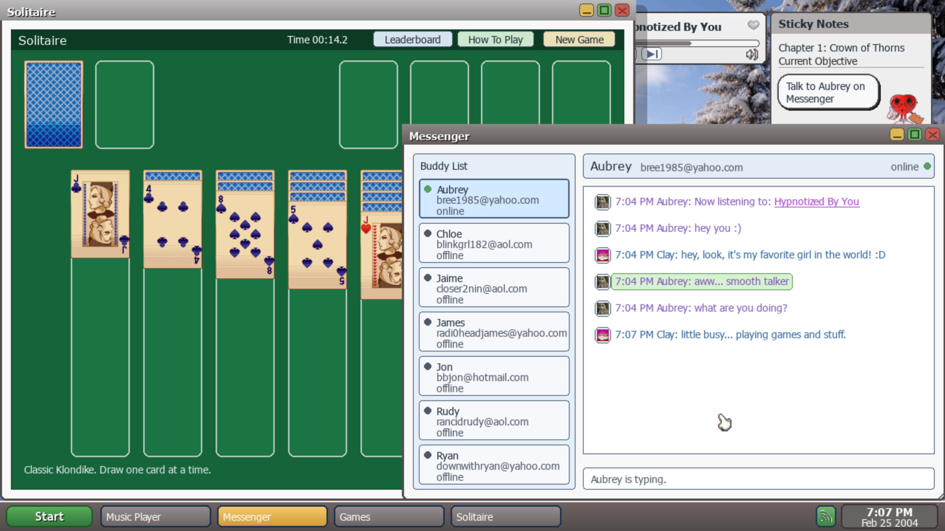 Step into a cluttered 2004 desktop packed with Messenger chats, IRC, email, music, weird websites, and late-night choices.