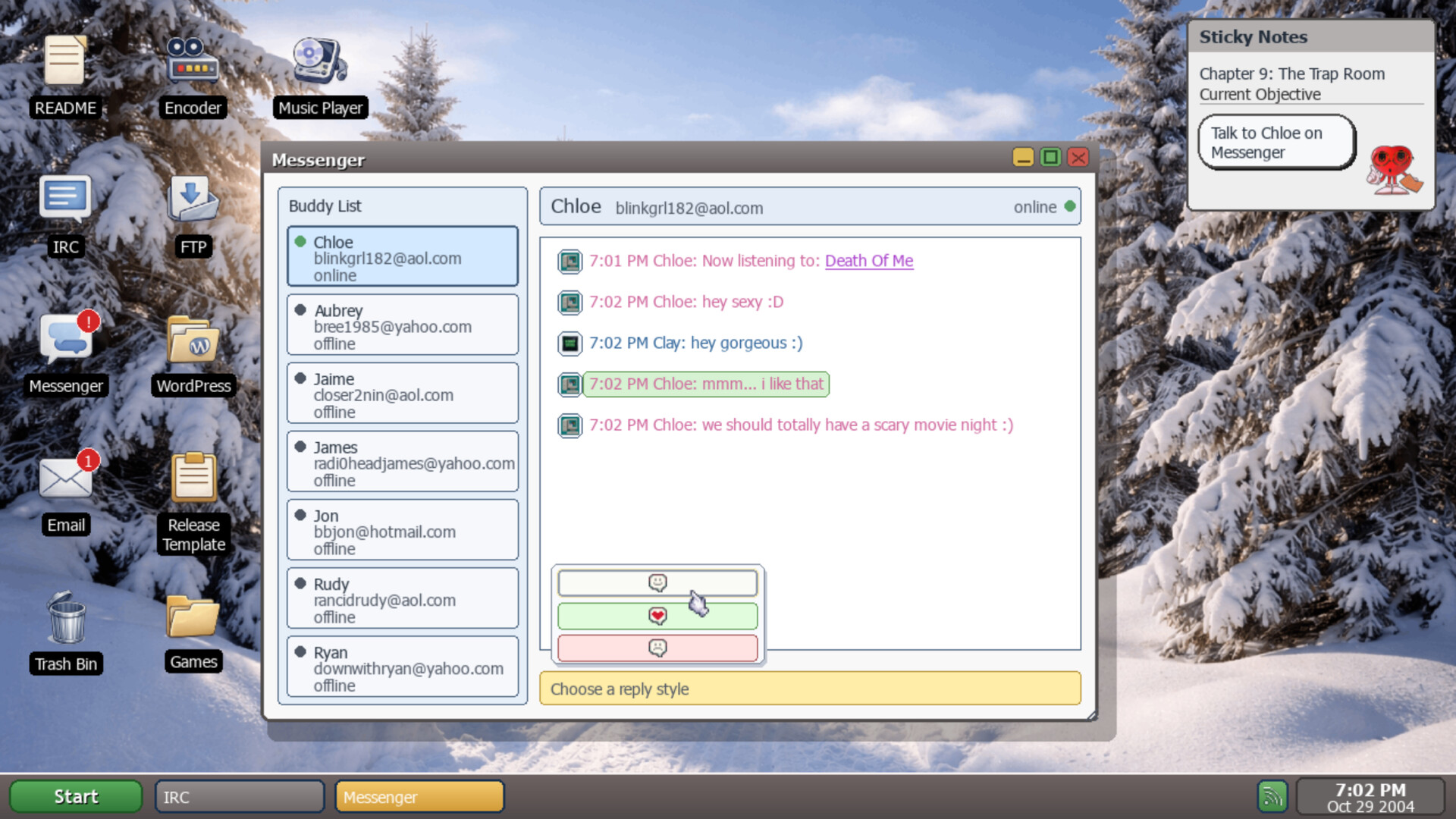 LifeSimOS is a story-rich coming-of-age experience set in 2004, where your world unfolds through a cluttered desktop filled with Messenger chats, IRC conversations, email, music, and late-night choices. Build friendships, navigate messy relationships, explore strange corners of the early internet, and shape your path through a branching story with multiple endings.