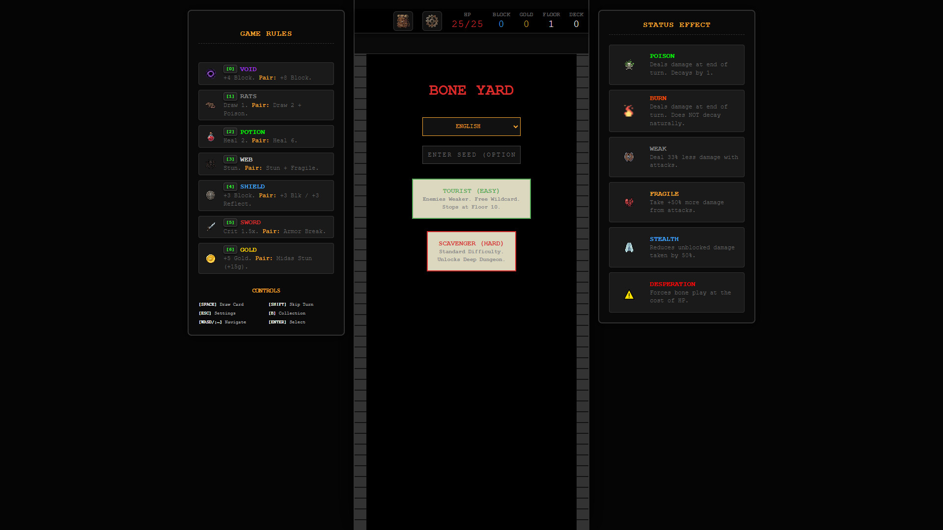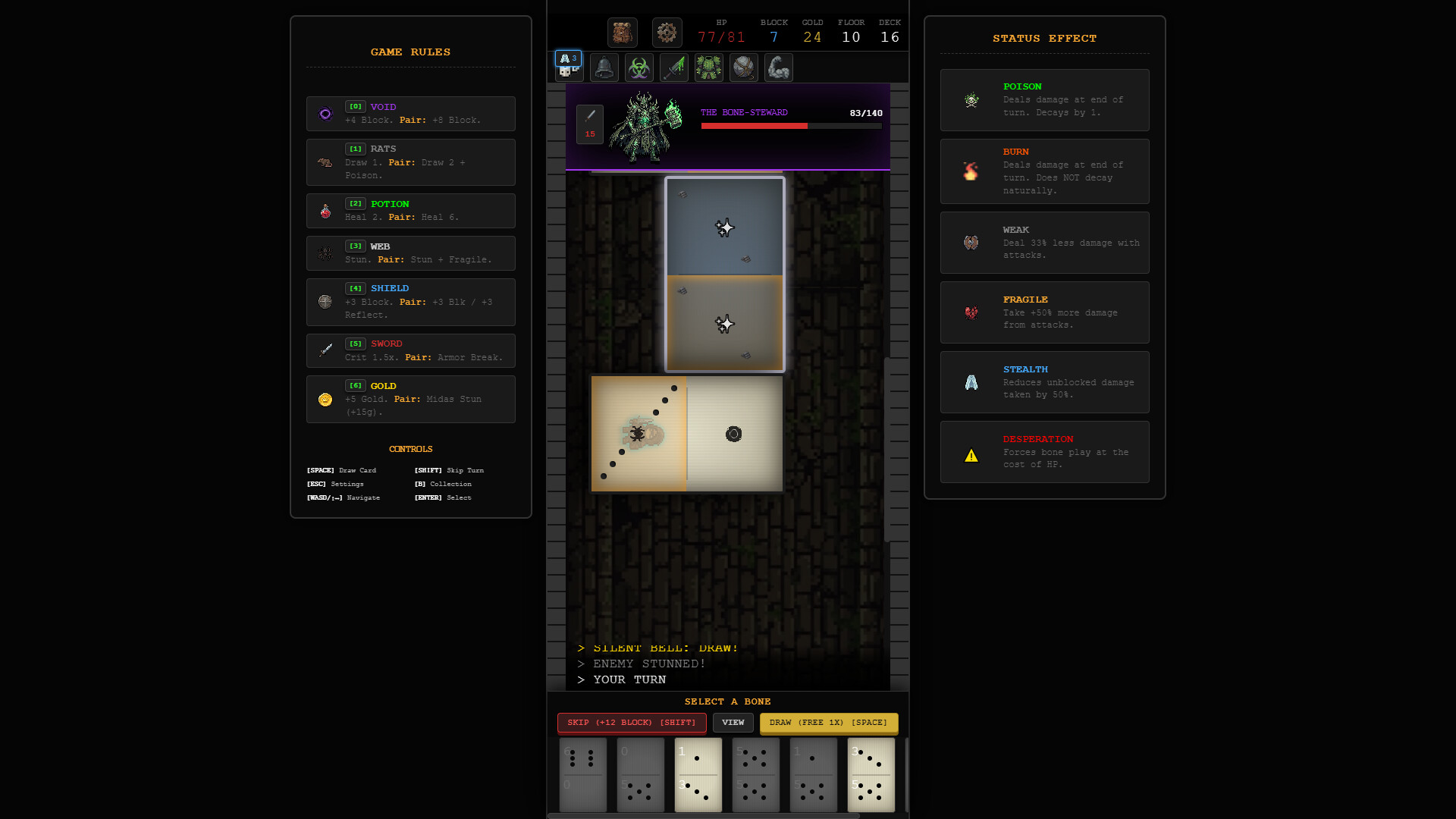 The Bone Yard is a tactical roguelike that replaces traditional cards with domino-style bone tiles. Connect matching pips to attack, defend, and cast spells as you descend through 10 grueling floors.