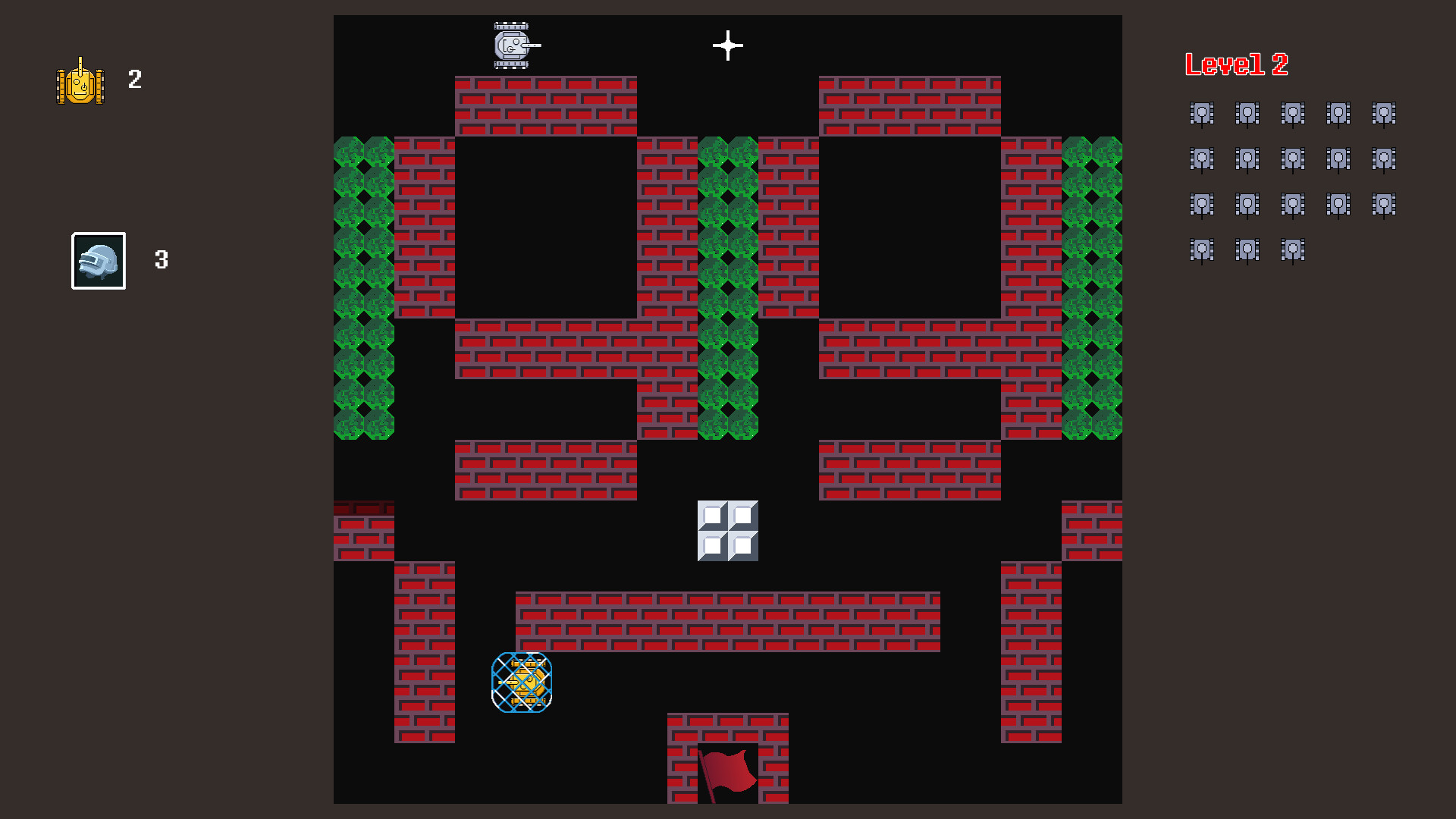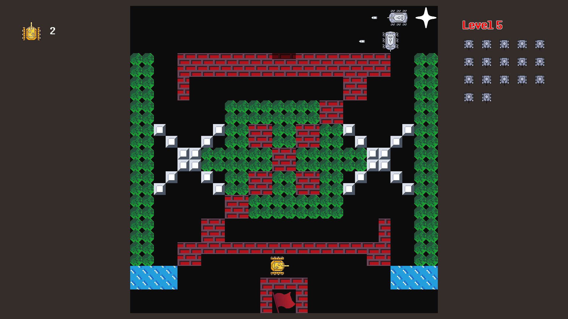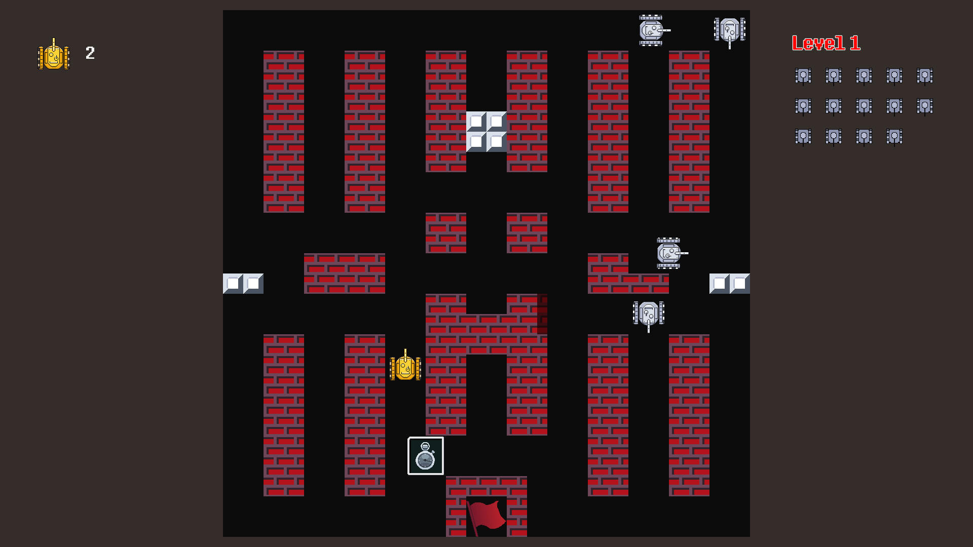 The player controls a yellow tank (Player 1) and/or a green tank (Player 2) to defend the red flag located at the bottom of the level from being destroyed by enemy tanks. Each level requires destroying all 20 enemy tanks while avoiding the destruction of the player's own tank(s). The game features 99 standard levels.